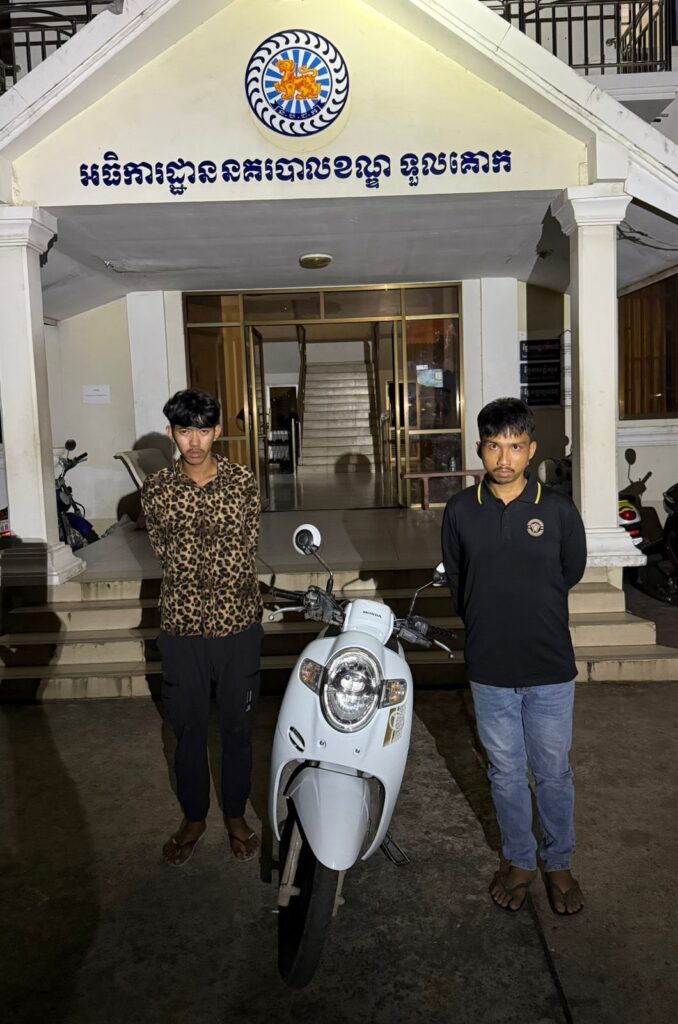 ភ្នំពេញ ៖ នៅថ្ងៃទី៣១ ខែតុលា ឆ្នាំ២០២៥ វេលាម៉ោងប្រហែល២២:១០នាទីយប់ កម្លាំងផ្នែកជំនាញ នៃអធិការដ្ឋាននគរបាលខណ្ឌទួលគោក បានធ្វើការស្រាវជ្រាវឃាត់ខ្លួនជនសង្ស័យ០២នាក់ពីបទលួចម៉ូតូ០១គ្រឿងម៉ាកHONDA SCOOPY ពណ៌សនៅចំណុចលើផ្លូវលេខ២១៥ កែងផ្លូវលេខ២៣០ សង្កាត់ផ្សារដើមគ ខណ្ឌទួលគោក ប្រព្រឹត្តបទល្មើសនៅចំណុចមុខហាងលក់ពូកយីហោសំបូរលាភ ផ្លូវលេខ២៧១ ក្រុមទី៣២ ភូមិ១២ សង្កាត់ទឹកល្អក់ទី៣ ខណ្ឌទួលគោក រាជធនីភ្នំពេញ កាលពីថ្ងៃទី៣០ ខែតុលា ឆ្នាំ២០២៥ វេលាម៉ោងប្រហែល០៩:១៧នាទី ។