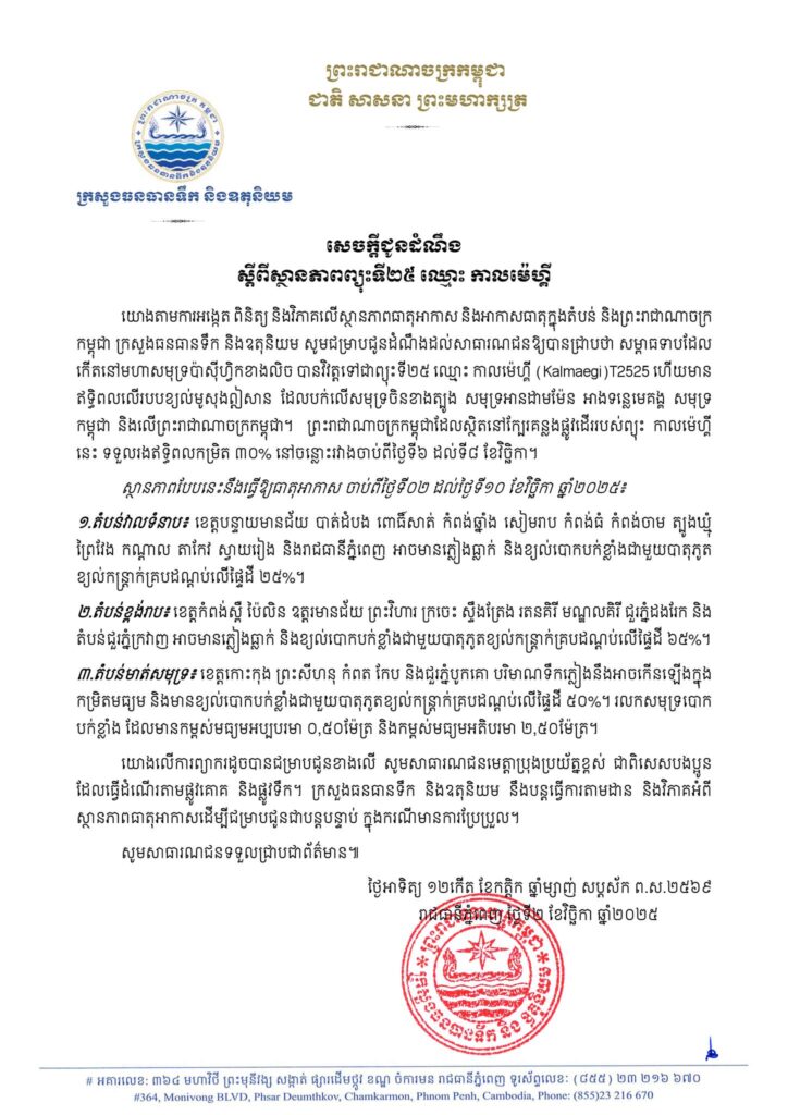 ក្រសួងធនធានទឹក និងឧតុនិយម នៅថ្ងៃទី២ ខែវិច្ឆិកា ឆ្នាំ២០២៥បានចេញសេចក្តីជូនដំណឹង ស្ដីពីស្ថានភាពព្យុះទី២៥ ឈ្មោះ កាលម៉េហ្គី។ យោងតាមការអង្កេត ពិនិត្យ និងវិភាគលើស្ថានភាពធាតុអាកាស និងអាកាសធាតុក្នុងតំបន់ និងព្រះរាជាណាចក្រ កម្ពុជា ក្រសួងធនធានទឹក និងឧតុនិយម សូមជម្រាបជូនដំណឹងដល់សាធារណជនឱ្យបានជ្រាបថា សម្ពាធទាបដែល កើតនៅមហាសមុទ្រប៉ាស៊ីហ្វិកខាងលិច បានវិវត្តទៅជាព្យុះទី២៥ ឈ្មោះ កាលម៉េហ្គី (Kalmaegi)T2525 ហើយមាន ឥទ្ធិពលលើរបបខ្យល់មូសុងឦសាន ដែលបក់លើសមុទ្រចិនខាងត្បូង សមុទ្រអានដាមម៉ែន អាងទន្លេមេគង្គ សមុទ្រ កម្ពុជា និងលើព្រះរាជាណាចក្រកម្ពុជា។ ព្រះរាជាណាចក្រកម្ពុជាដែលស្ថិតនៅក្បែរគន្លងផ្លូវដើររបស់ព្យុះ កាលម៉េហ្គី នេះ ទទួលរងឥទ្ធិពលកម្រិត ៣០% នៅចន្លោះរវាងចាប់ពីថ្ងៃទី៦ ដល់ទី៨ ខែវិច្ឆិកា។