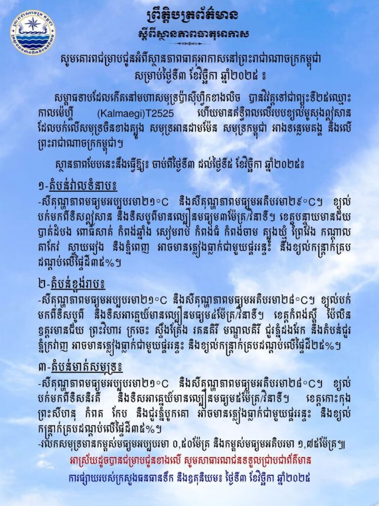 ភ្នំពេញ ៖ ក្រសួងធនធានទឹកនិងឧតុនិយម បានចេញសេចក្តីជូនដំណឹងអំពីស្ថានភាពធាតុអាកាសនៅព្រះរាជាណាចក្រកម្ពុជា សម្រាប់ថ្ងៃទី៣ ខែវិច្ឆិកា ឆ្នាំ២០២៥៖