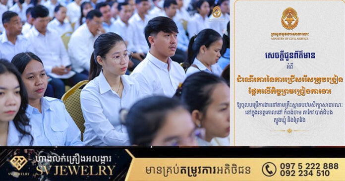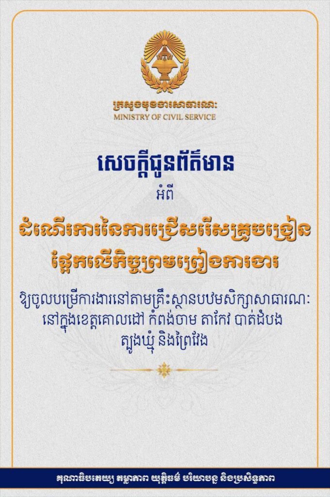 ភ្នំពេញ ៖ ក្រសួងមុខងារសាធារណៈ ចេញសេចក្តីជូនដំណឹង អំពី «ដំណើរការនៃការជ្រើសរើសគ្រូបង្រៀនផ្អែកលើកិច្ចព្រមព្រៀងការងារឱ្យចូលបម្រើ ការងារនៅតាមគ្រឹះស្ថានបឋមសិក្សាសាធារណៈ នៅក្នុងខេត្តគោលដៅ កំពង់ចាម តាកែវ បាត់ដំបង ត្បូងឃ្មុំ និងព្រៃវែង»។