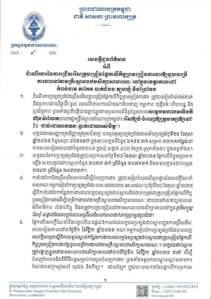 បេក្ខជនមានសញ្ញាបត្របរិញ្ញាបត្រគ្រប់ជំនាញ បានចូលរួមប្រឡងប្រជែងនាសម័យប្រឡងថ្ងៃទី២៥ ខែតុលា ឆ្នាំ២០២៥ ចំនួនសរុប ៨៨៩៥នាក់ ក្នុងនោះបេក្ខនារីចំនួន ៦១៩៥ នាក់ សម្រាប់ ៣២១៣កន្លែងនៅ តាមសាលារៀនគោលដៅចំនួន២២០៩ ក្នុងឃុំ សង្កាត់ ៤០២ នៃក្រុង ស្រុកទាំង៥០ ក្នុងខេត្តទាំង៥។ លទ្ធផលនៃការប្រឡងប្រជែងត្រូវបានប្រកាសនាថ្ងៃទី២៨ ខែតុលា ឆ្នាំ២០២៥ ផ្អែកលើពិន្ទុមធ្យមភាគ ឡើង មានបេក្ខជនជាប់ស្ថាពរចំនួន ៣០២៣ នាក់ ស្រីចំនួន ២០៧១នាក់ និងមានបេក្ខជនជាប់បម្រុង ៣៥៤៣ ស្រីចំនួន ២៤៩៣នាក់។