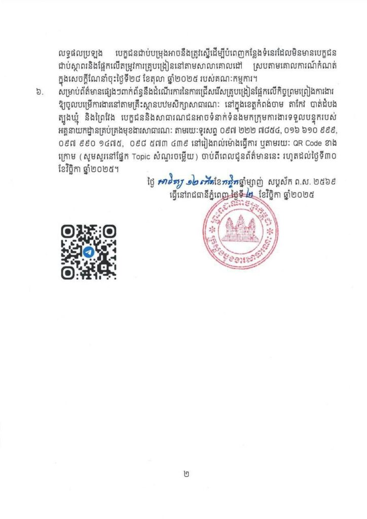 ឱ្យចូលបម្រើការងារនៅតាមគ្រឹះស្ថានបឋមសិក្សាសាធារណៈ នៅក្នុងខេត្តកំពង់ចាម តាកែវ បាត់ដំបង ត្បូងឃ្មុំ និង ព្រៃវែង បេក្ខជននិងសាធារណជនអាចទំនាក់ទំនងមកក្រុមការងារទទួលបន្ទុករបស់ អគ្គនាយកដ្ឋានគ្រប់គ្រងមុខងារសាធារណៈ តាមរយៈទូរសព្ទ ០៩៧ ២២២ ៧៨៥៤, ០១៦ ៦១០ ៩៩៩, ០៩៧ ៩៩០ ១៤៧៥, ០៩៨ ៥៧៣ ៤៣៩ នៅរៀងរាល់ម៉ោងធ្វើការ ឬតាមរយៈ QR Code ខាង ក្រោម (សូមសួរនៅផ្នែក Topic សំណួរចម្លើយ) ចាប់ពីពេលជូនព័ត៌មាននេះ រហូតដល់ថ្ងៃទី៣០ ខែវិច្ឆិកា ឆ្នាំ២០២៥៕