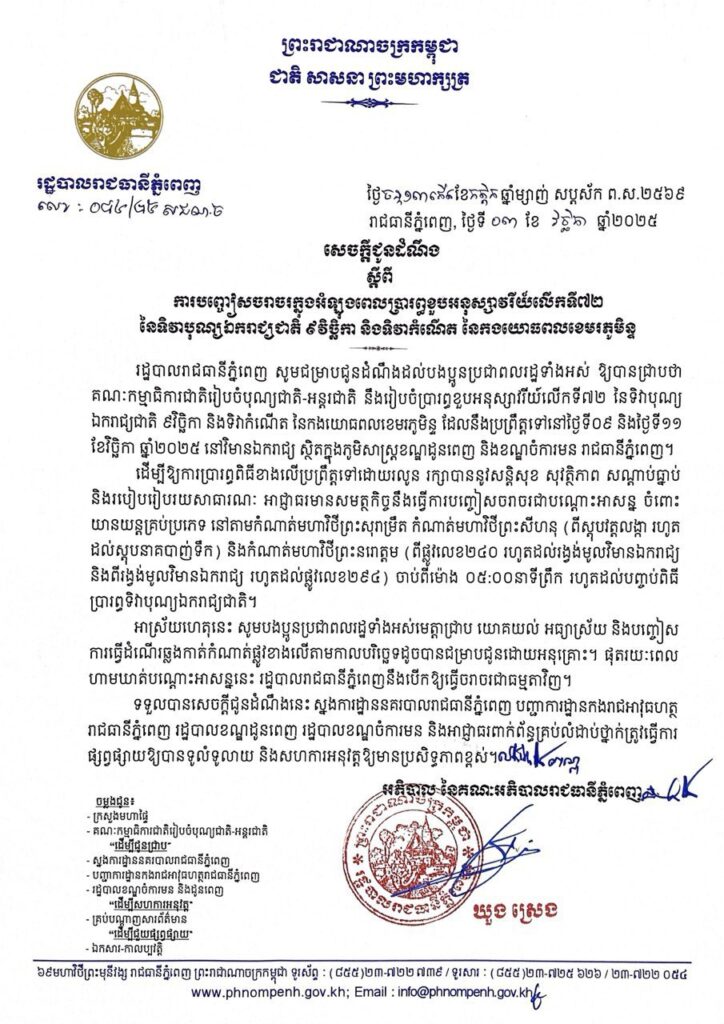 រដ្ឋបាលរាជធានីភ្នំពេញ សូមជម្រាបជូនដំណឹងដល់បងប្អូនប្រជាពលរដ្ឋទាំងអស់ ឱ្យបានជ្រាបថា គណៈកម្មាធិការជាតិរៀបចំបុណ្យជាតិ-អន្តរជាតិ នឹងរៀបចំប្រារព្ធខួបអនុស្សាវរីយ៍លើកទី៧២ នៃទិវាបុណ្យ ឯករាជ្យជាតិ ៩វិច្ឆិកា និងទិវាកំណើត នៃកងយោធពលខេមរភូមិន្ទ ដែលនឹងប្រព្រឹត្តទៅនៅថ្ងៃទី០៩ និងថ្ងៃទី១១ ខែវិច្ឆិកា ឆ្នាំ២០២៥ នៅវិមានឯករាជ្យ ស្ថិតក្នុងភូមិសាស្ត្រខណ្ឌដូនពេញ និងខណ្ឌចំការមន រាជធានីភ្នំពេញ។