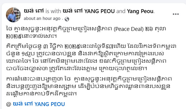 តាមរយៈបណ្តាញសង្គមានថ្ងៃចន្ទនេះ លោកបណ្ឌិត យង់ ពៅ បានថ្លែងថា គិតត្រឹមថ្ងៃចន្ទ ៣ វិច្ឆិកា ២០២៥នេះជាថ្ងៃទី៩៧ហើយ ដែលវីរកងទ័ពកម្ពុជាចំនួន ១៨រូប ត្រូវបានចាប់ខ្លួន និងដាក់ឱ្យស្ថិតក្រោមការឃុំគ្រងរបស់យោធាថៃ។ ថៃ នៅតែមិនព្រមដោះលែង ខណៈកិច្ចព្រមព្រៀងសន្តិភាព បាចចែងច្បាស់ថា ត្រូវតែដោះលែងភ្លាម ក្រោយចុះហត្ថលេខា។
