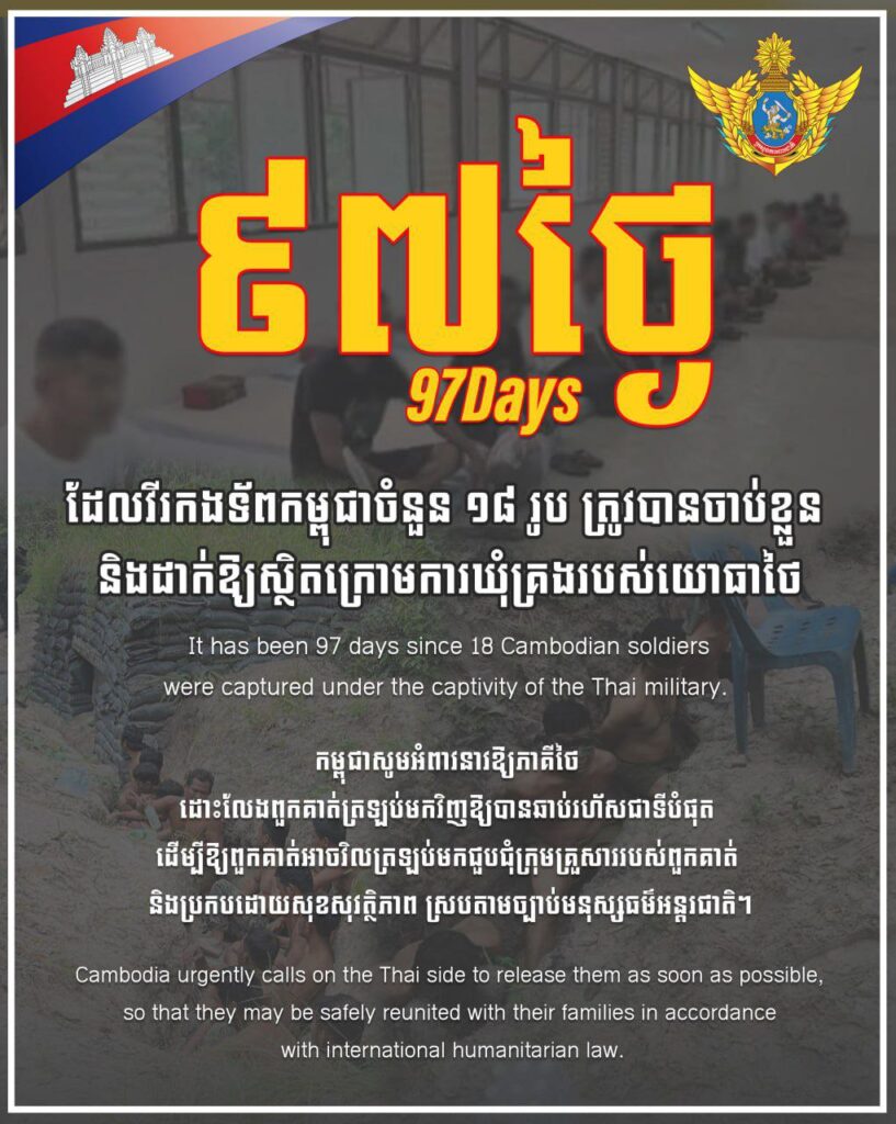 បើតាមក្រសួងការពារជាតិ បានប្រកាសថា ថ្ងៃនេះជា ថ្ងៃទី៩៧ហើយ ដែលវីរកងទ័ពកម្ពុជាចំនួន ១៨រូប ត្រូវបានចាប់ខ្លួន និងដាក់ឱ្យស្ថិតក្រោមការឃុំគ្រងរបស់យោធាថៃ។