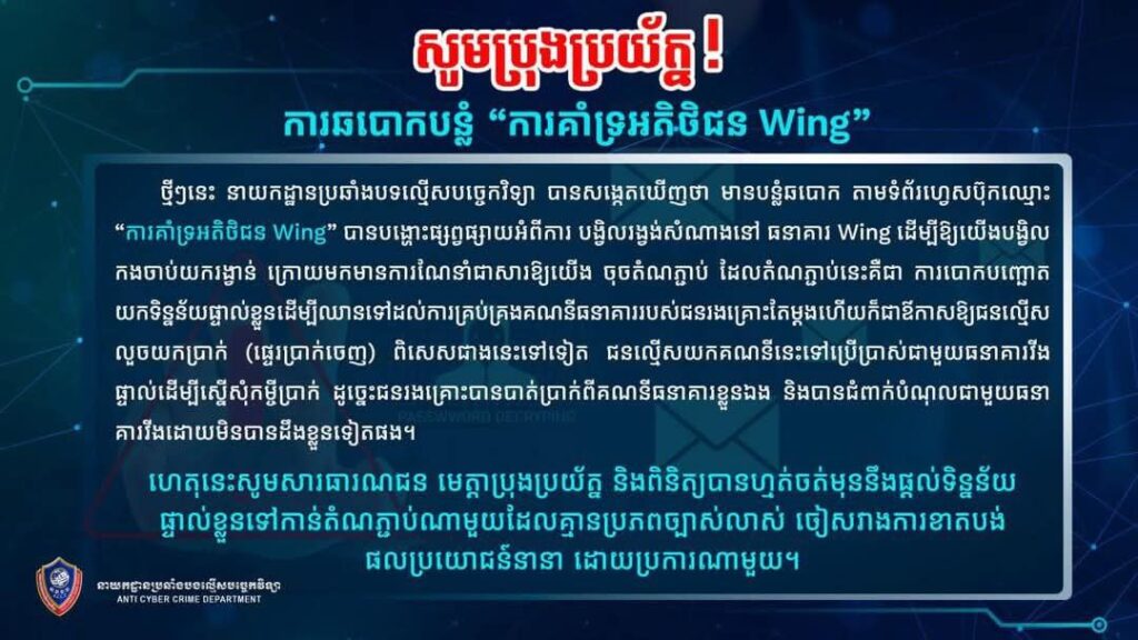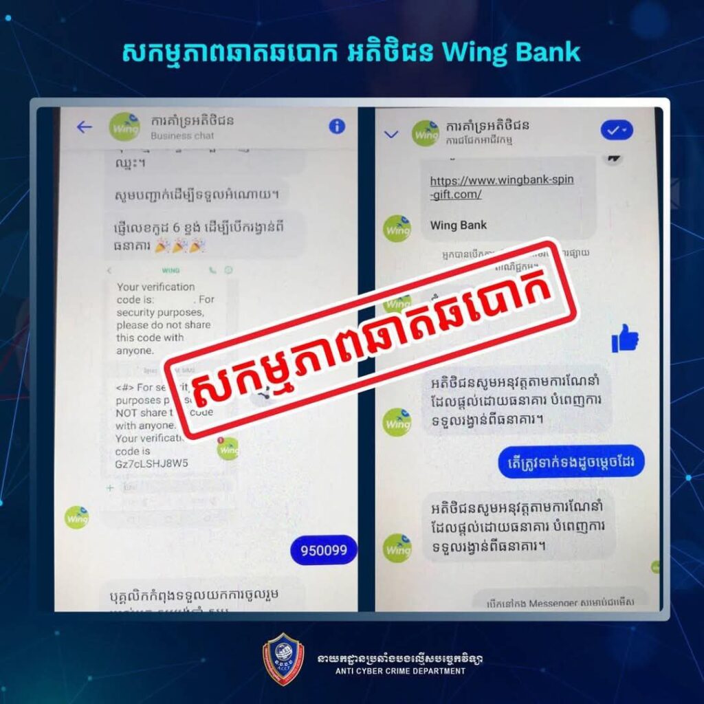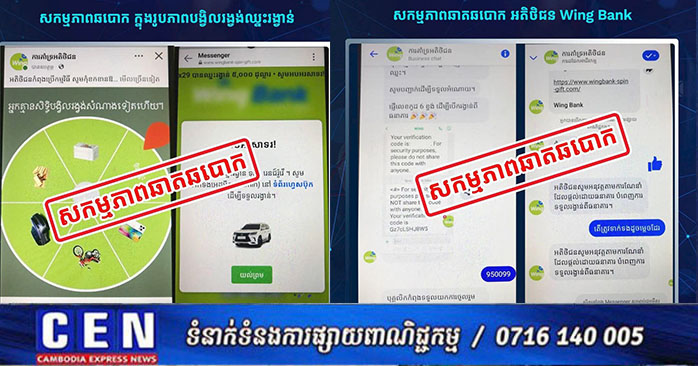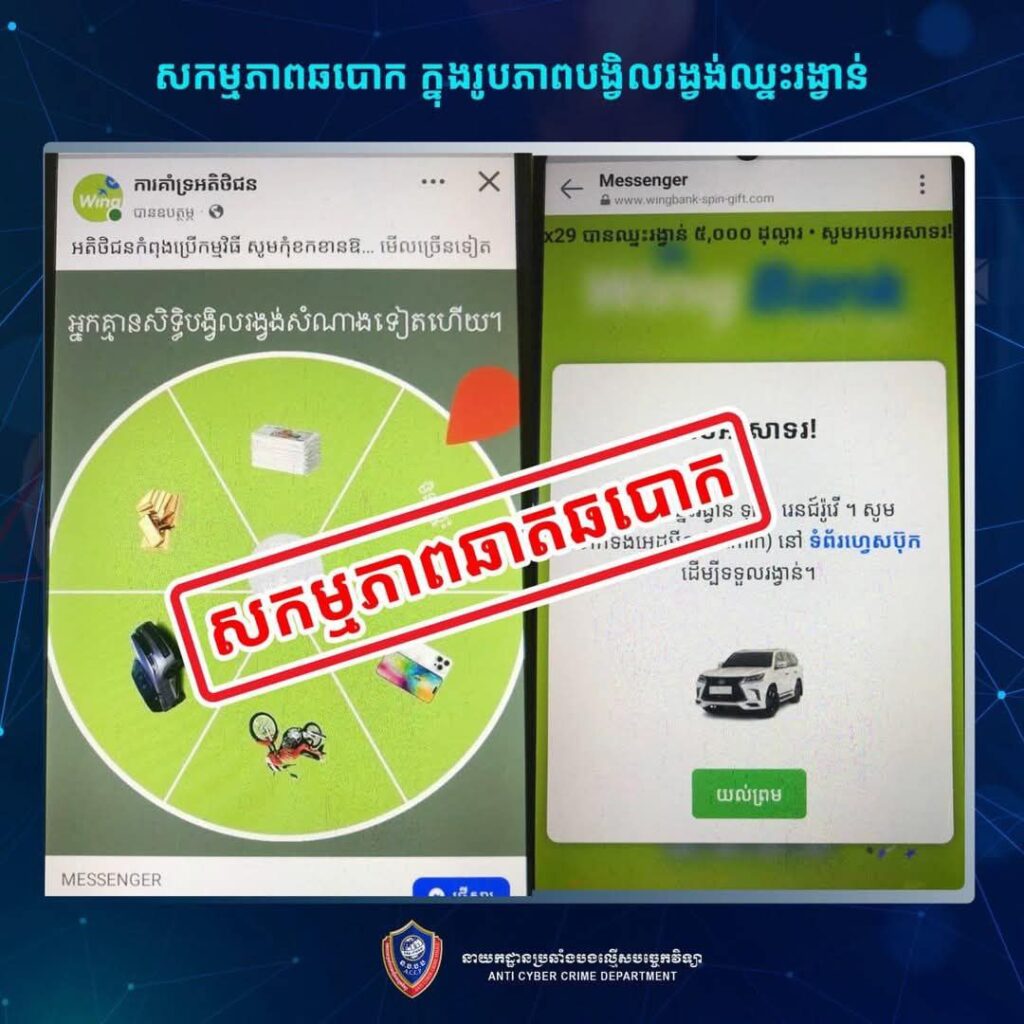 ភ្នំពេញ ៖ ថ្មីៗនេះ នាយកដ្ឋានប្រឆាំងបទល្មើសបច្ចេកវិទ្យា បានសង្កេតឃើញថា មានឆបោក តាមទំព័រហ្វេសប៊ុកឈ្មោះ “ការគាំទ្រអតិថិជន” បានបង្ហោះផ្សព្វផ្សាយអំពីការ បង្វិលរង្វង់សំណាងនៅ ធនាគារ Wing ដើម្បីឱ្យយើងបង្វិលកងចាប់យករង្វាន់ ក្រោយមកមានការណែនាំជាសារឱ្យយើង ចុចតំណភ្ជាប់ ដែលតំណភ្ជាប់នេះគឺជា ការបោកបញ្ឆោតយកទិន្នន័យផ្ទាល់ខ្លួន ដើម្បីឈានទៅដល់ការគ្រប់គ្រងគណនីធនាគាររបស់ជនរងគ្រោះតែម្តង ហើយក៏ជាឱកាសឱ្យជនល្មើសលួចយកប្រាក់(ផ្ទេរប្រាក់ចេញ) ពិសេសជាងនេះទៅទៀត ជនល្មើសយកគណនីនេះទៅប្រើប្រាស់ជាមួយធនាគារវីងផ្ទាល់ដើម្បីស្នើសុំកម្ចីប្រាក់ ដូច្នេះជនរងគ្រោះបានបាត់ប្រាក់ពីគណនីធនាគារខ្លួនឯង និងបានជំពាក់បំណុលជាមួយធនាគារវីងដោយមិនបានដឹងខ្លួនទៀតផង។