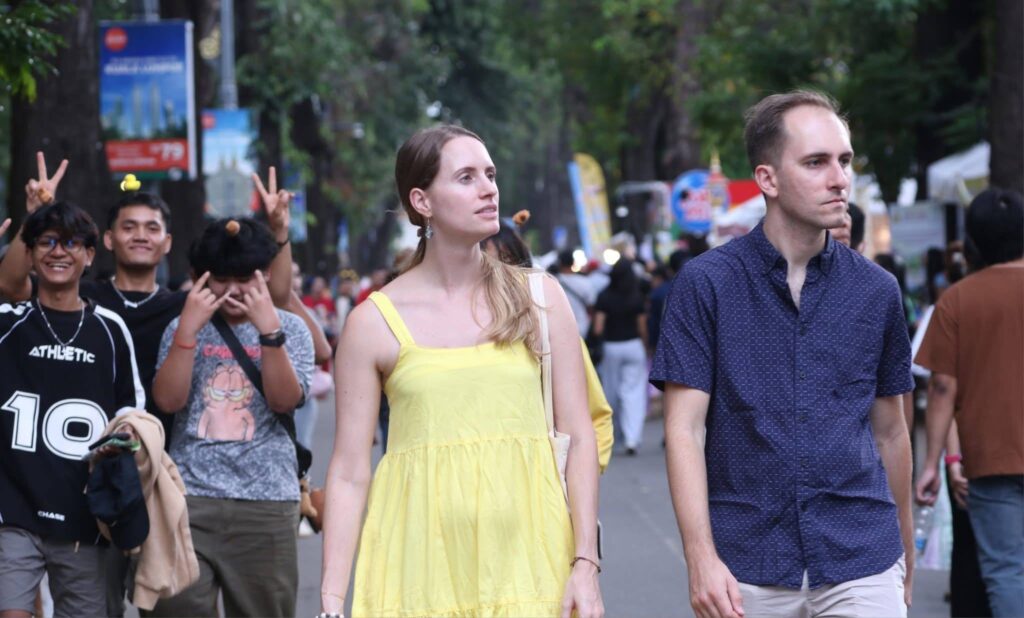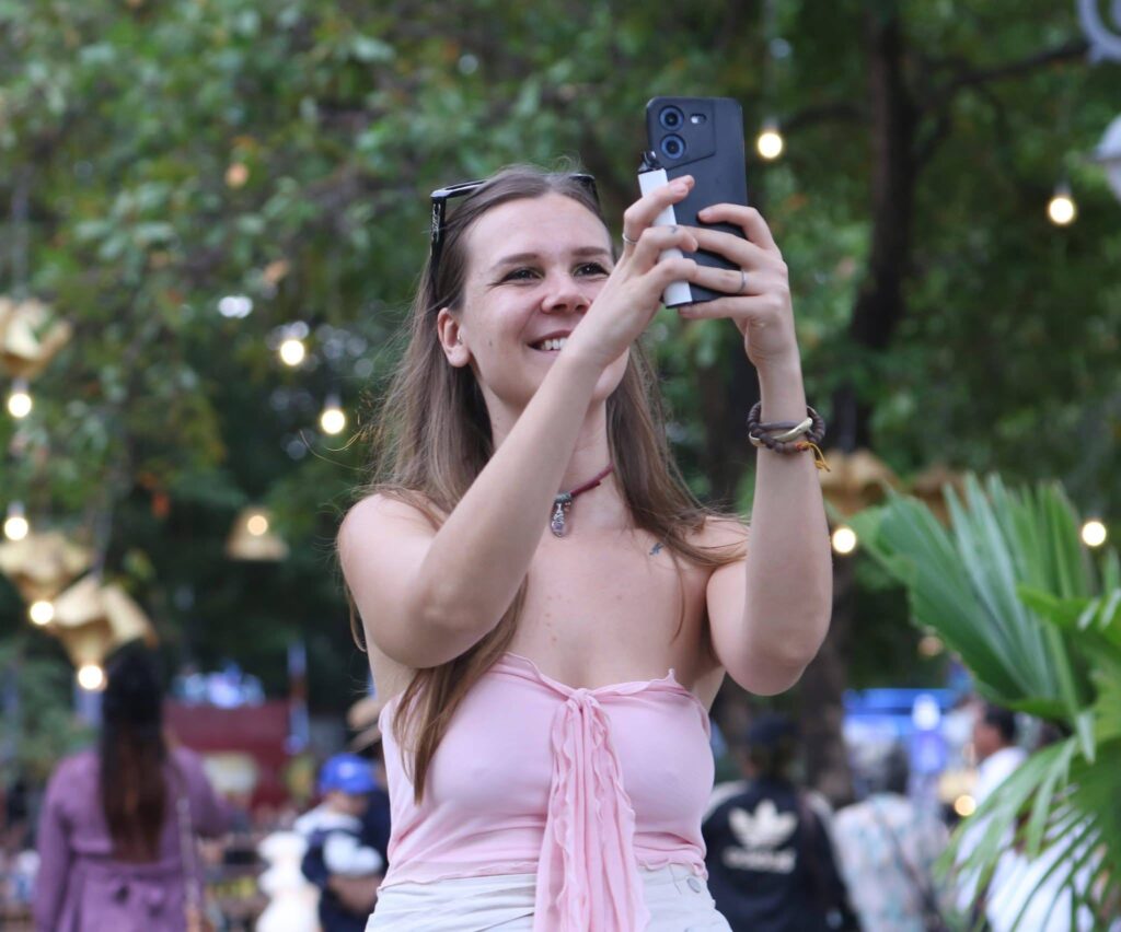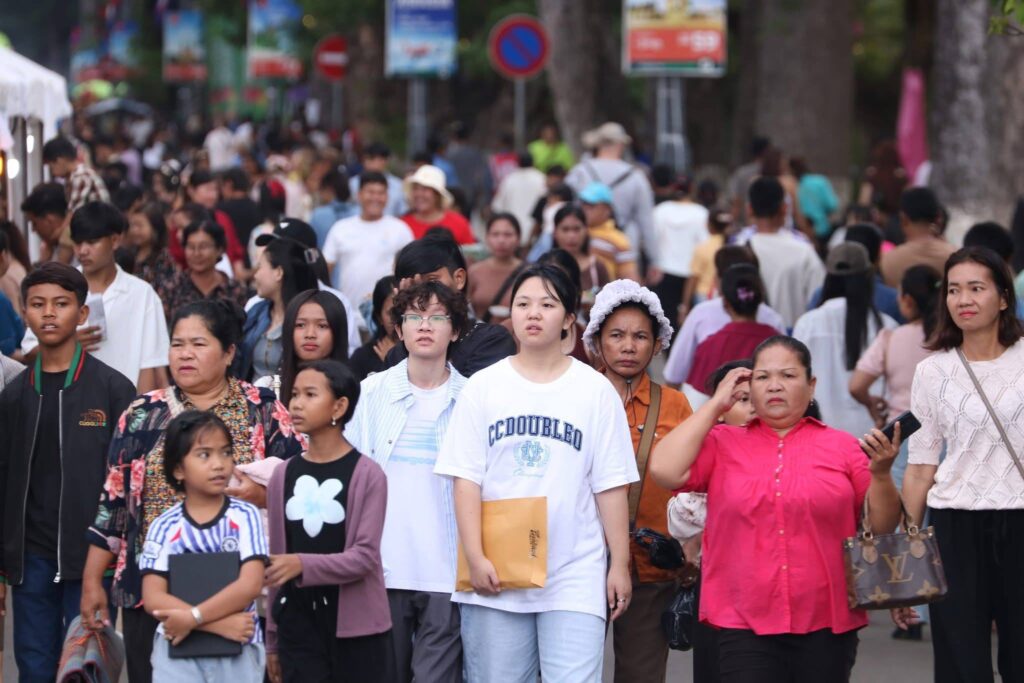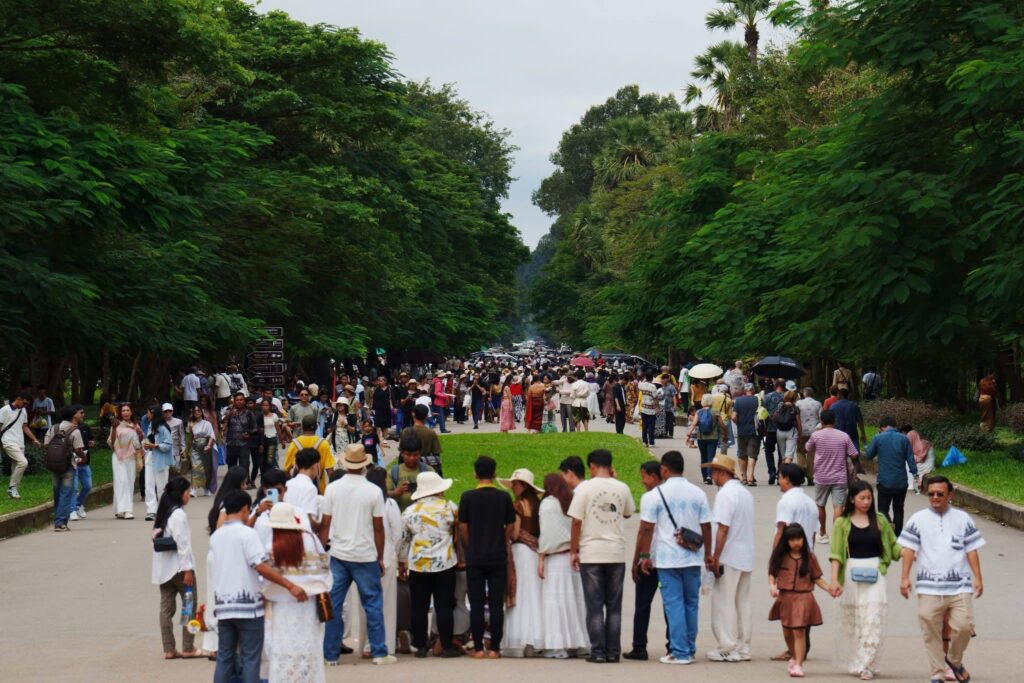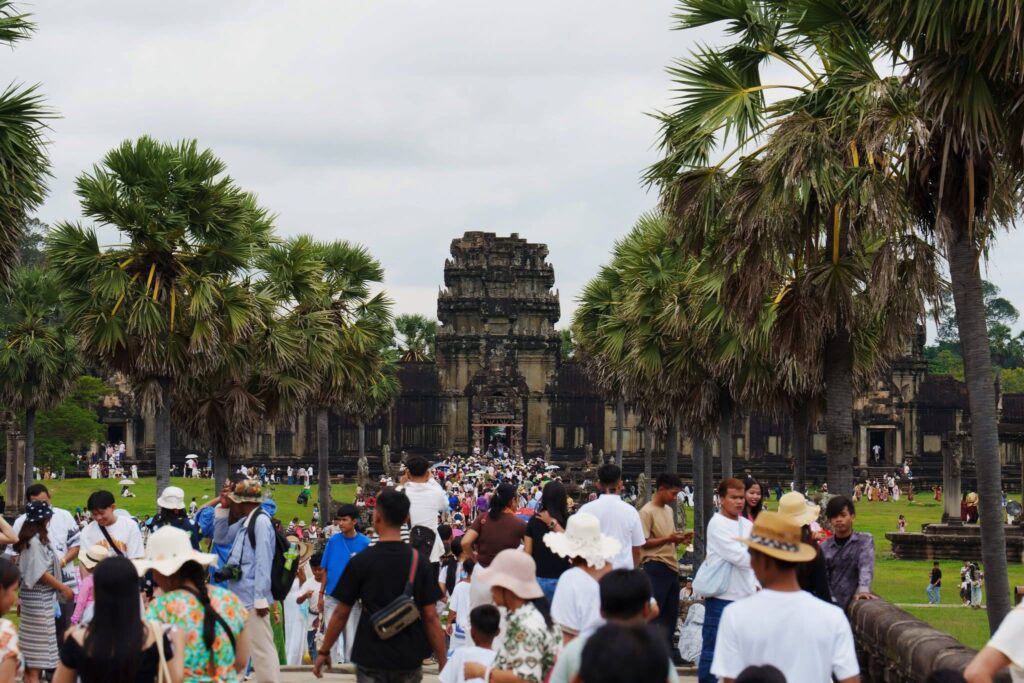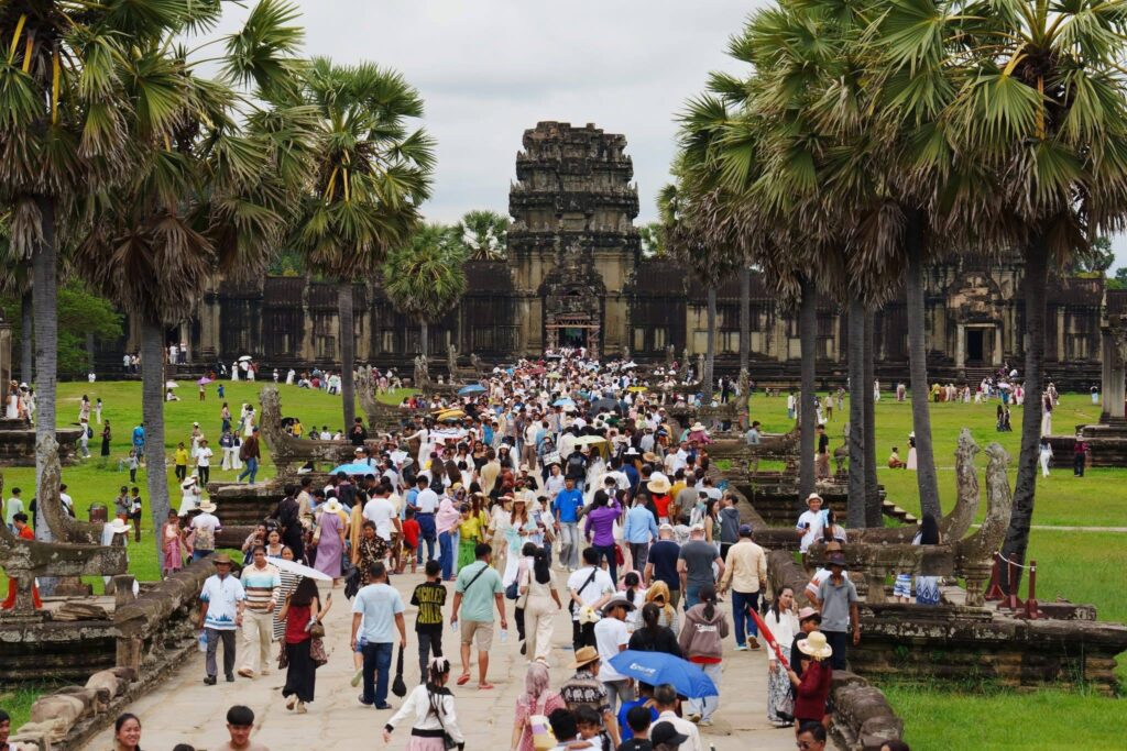 ទិដ្ឋភាពភ្ញៀវទេសចរជាតិ អន្តរជាតិ មកលេងកម្សាន្តនៅប្រាសាទអង្គរវត្ត ថ្ងៃទីមួយនៃព្រះរាជពិធីបុណ្យអុំទូក បណ្ដែតប្រទីប និងសំពះព្រះខែ អកអំបុក។