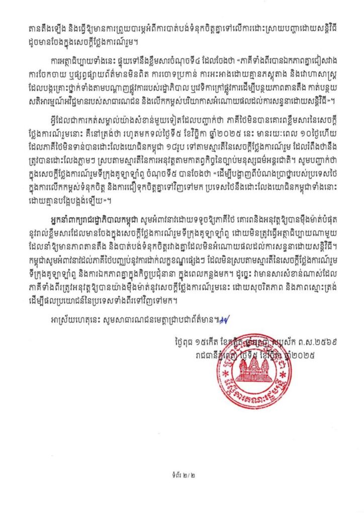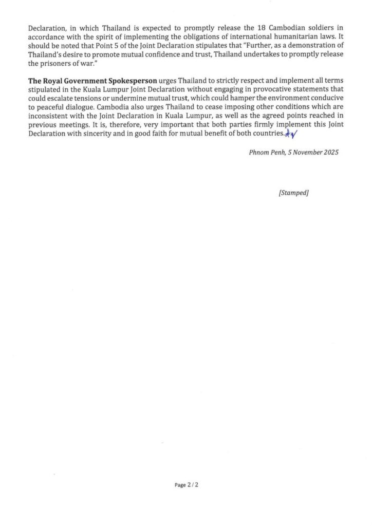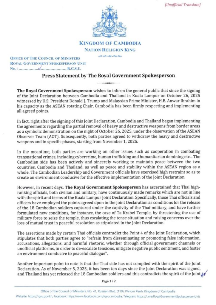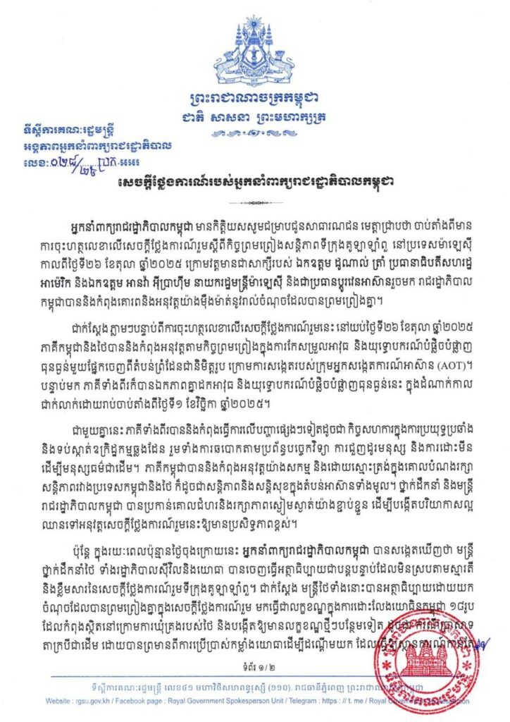 ភ្នំពេញ ៖ នៅថ្ងៃទី៥ ខែវិច្ឆិកា ឆ្នាំ២០២៥អ្នកនាំពាក្យរាជរដ្ឋាភិបាលកម្ពុជា មានកិត្តិយសសូមជម្រាបជូនសាធារណជន មេត្តាជ្រាបថា ចាប់តាំងពីមាន ការចុះហត្ថលេខាលើសេចក្ដីថ្លែងការណ៍រួមស្ដីពីកិច្ចព្រមព្រៀងសន្តិភាពទីក្រុងគូឡាឡាំពួ នៅប្រទេសម៉ាឡេស៊ី កាលពីថ្ងៃទី២៦ ខែតុលា ឆ្នាំ២០២៥ ក្រោមវត្តមានជាសាក្សីរបស់ ឯកឧត្តម ដូណាល់ ត្រាំ ប្រធានាធិបតីសហរដ្ឋ អាម៉េរិក និងឯកឧត្តម អានវ៉ា អ៊ីប្រាហ៊ីម នាយករដ្ឋមន្ត្រីម៉ាឡេស៊ី និងជាប្រធានប្តូរវេនអាស៊ានរួចមក រាជរដ្ឋាភិបាល កម្ពុជាបាននិងកំពុងគោរពនិងអនុវត្តយ៉ាងម៉ឺងម៉ាត់នូវរាល់ចំណុចដែលបានព្រមព្រៀងគ្នា។