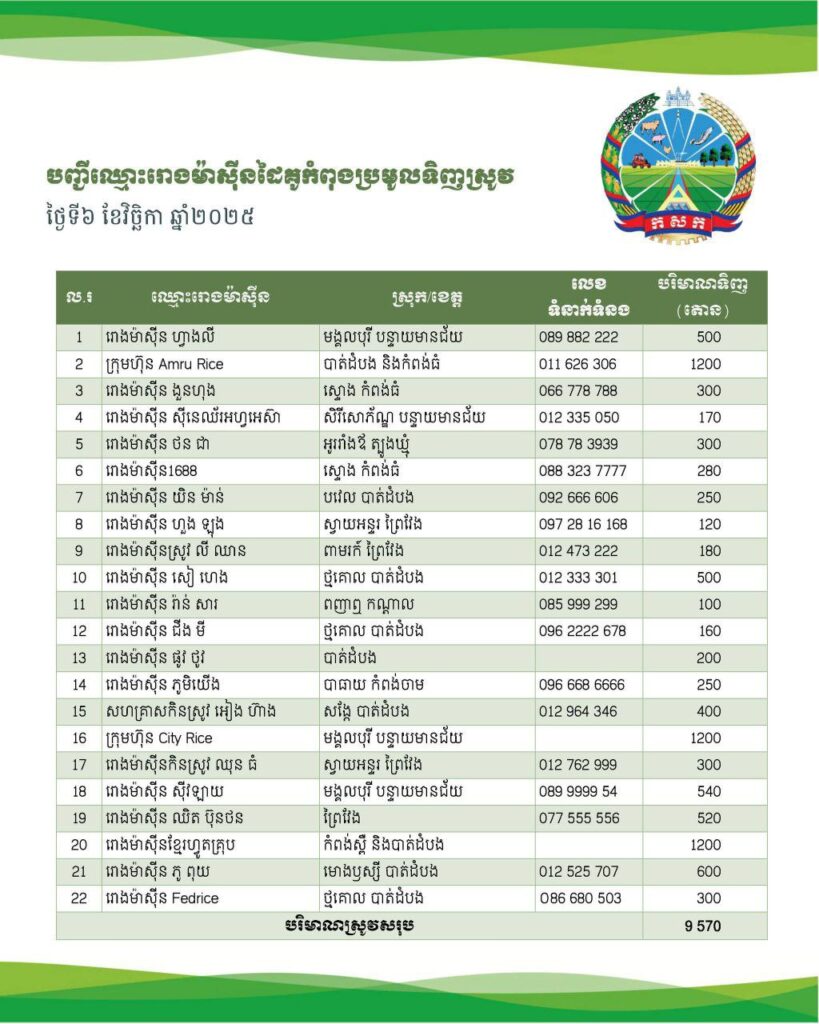 ភ្នំពេញ ៖ ក្រសួងកសិកម្ម រុក្ខាប្រមាញ់ និងនេសាទ នាថ្ងៃទី៦ខែវិច្ឆិកានេះ បានចេញរបាយការណ៍ឲ្យដឹងថា បរិមាណស្រូវសើមជិត១មុឺនតោន ត្រូវបានរោងម៉ាសុីន ដៃគូជាមួយក្រសួងកសិកម្ម សម្រុកប្រមូលទិញពីបងប្អូនកសិករនៅទូទាំងប្រទេសក្នុងថ្ងៃនេះ។