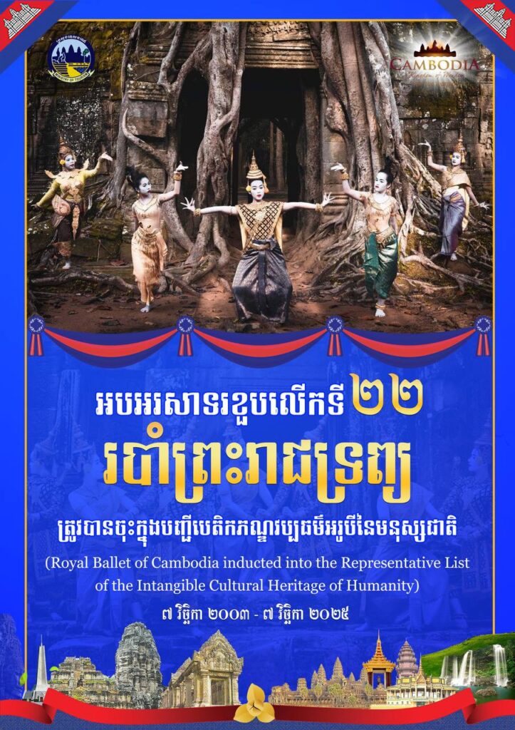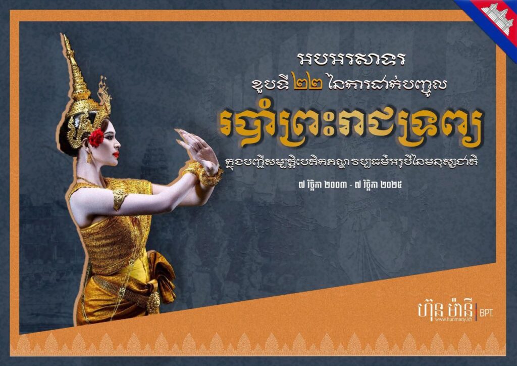 ភ្នំពេញ ៖ ឯកឧត្តមឧបនាយករដ្ឋមន្រ្តី ហ៊ុន ម៉ានី រដ្ឋមន្រ្តីក្រសួងមុខងារសាធារណៈ បានថ្លែងអបអរសាទរខួបលើកទី ២២ នៃ «របាំព្រះរាជទ្រព្យ» ដែលត្រូវបានដាក់បញ្ចូលក្នុងបញ្ជីជាសម្បត្តិបេតិកភណ្ឌវប្បធម៌អរូបីនៃមនុស្សជាតិរបស់អង្គការយូណេស្កូ នៅទីក្រុងអ៊ីស្តង់ប៊ុល ប្រទេសតួកគី នាថ្ងៃទី៧ ខែវិច្ឆិកា ឆ្នាំ២០០៣។
