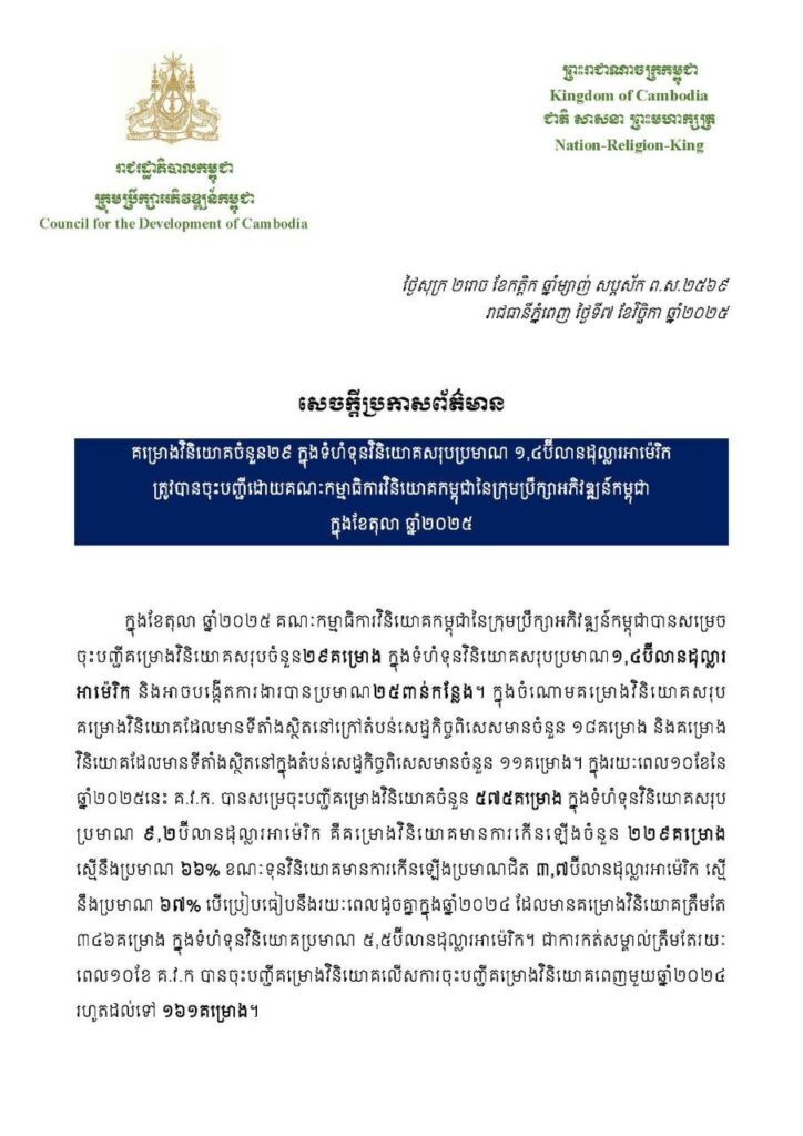 ភ្នំពេញ ៖ ក្រុមប្រឹក្សាអភិវឌ្ឍន៍កម្ពុជានៅថ្ងៃសុក្រ ទី៧ ខែវិច្ឆិកា ឆ្នាំ២០២៥បានចេញសេចក្តីប្រកាសព័ត៌មាន គម្រោងវិនិយោគចំនួន២៩ ក្នុងទំហំទុនវិនិយោគសរុបប្រមាណ ១,៤ប៊ីលានដុល្លារអាម៉េរិក ត្រូវបានចុះបញ្ជីដោយគណៈកម្មាធិការវិនិយោគកម្ពុជានៃក្រុមប្រឹក្សាអភិវឌ្ឍន៍កម្ពុជា ក្នុងខែតុលា ឆ្នាំ២០២៥។