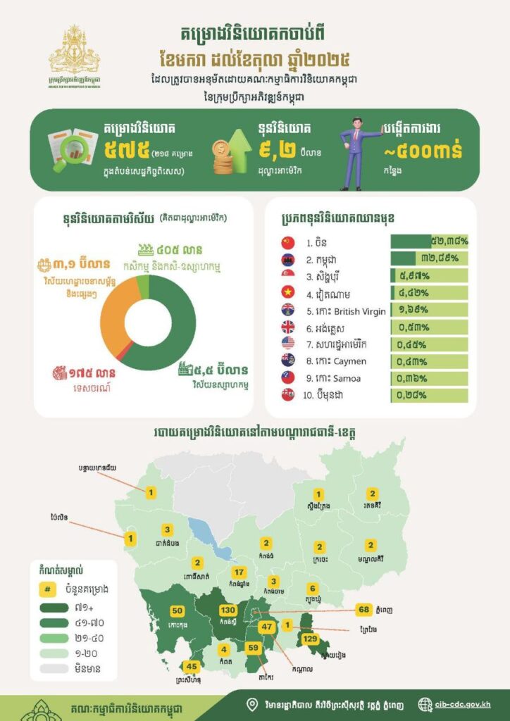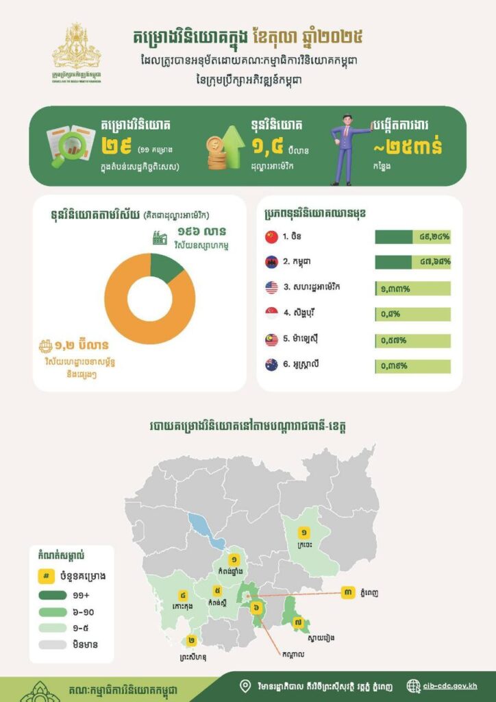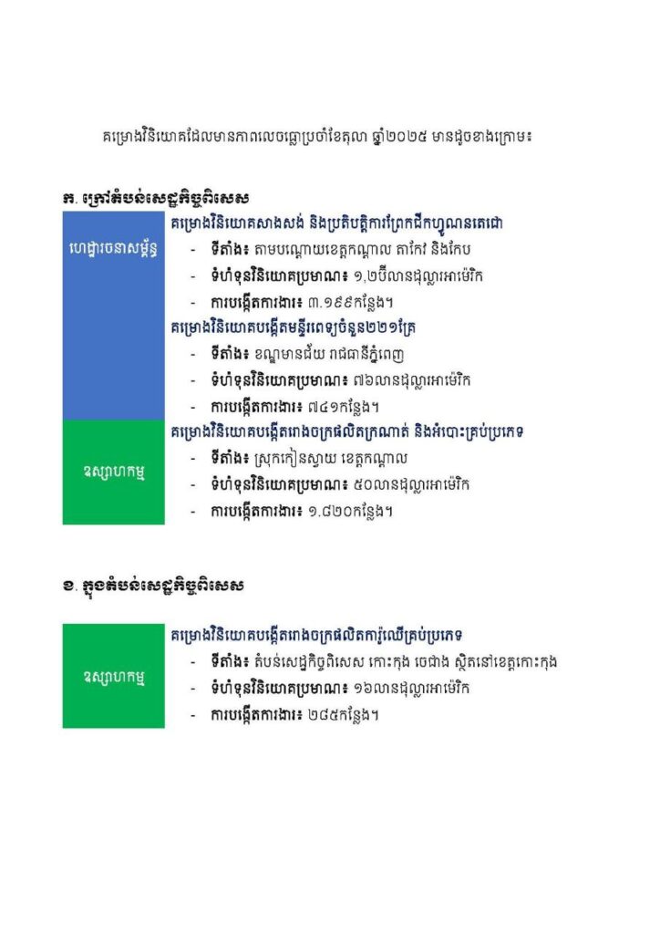 ក្នុងខែតុលា ឆ្នាំ២០២៥ គណៈកម្មាធិការវិនិយោគកម្ពុជានៃក្រុមប្រឹក្សាអភិវឌ្ឍន៍កម្ពុជាបានសម្រេច ចុះបញ្ជីគម្រោងវិនិយោគសរុបចំនួន២៩គម្រោង ក្នុងទំហំទុនវិនិយោគសរុបប្រមាណ១,៤ប៊ីលានដុល្លារ អាម៉េរិក និងអាចបង្កើតការងារបានប្រមាណ២៥ពាន់កន្លែង។ ក្នុងចំណោមគម្រោងវិនិយោគសរុប គម្រោងវិនិយោគដែលមានទីតាំងស្ថិតនៅក្រៅតំបន់សេដ្ឋកិច្ចពិសេសមានចំនួន ១៨គម្រោង និងគម្រោង វិនិយោគដែលមានទីតាំងស្ថិតនៅក្នុងតំបន់សេដ្ឋកិច្ចពិសេសមានចំនួន ១១គម្រោង។