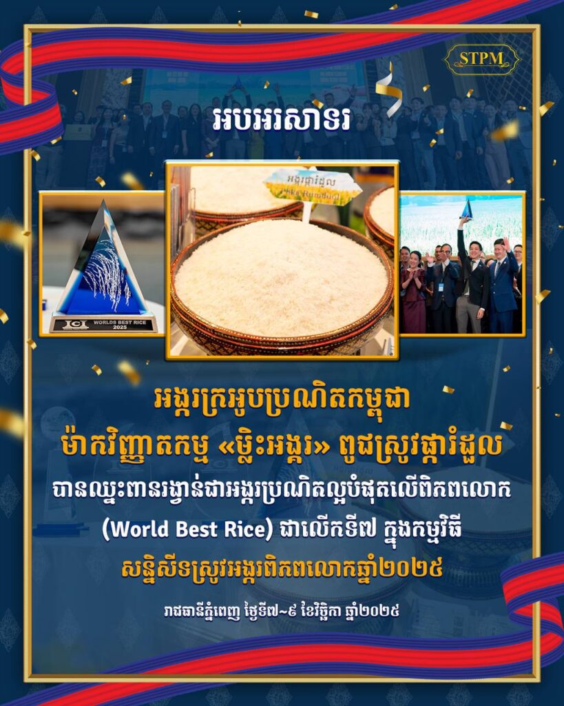 ភ្នំពេញ៖ អង្ករក្រអូបប្រណិតកម្ពុជា ម៉ាកវិញ្ញាតកម្ម « ម្លិះអង្គរ » ពូជស្រូវផ្ការំដួល បានឈ្នះពានរង្វាន់ជាអង្ករអប្រណិតល្អបំផុត លើពិភពលោក ជាលើកទី៧ ក្នុងការប្រកួតអង្ករល្អបំផុតលើពិភពលោក នៅក្នុងកម្មវិធី «សន្និសីទស្រូវអង្ករពិភពលោកឆ្នាំ២០២៥» (World Best Rice) ដែលរៀបចំដោយ The Rice Trader រយៈពេល ៣ថ្ងៃ ចាប់ពីថ្ងៃទី៧-៩ ខែវិច្ឆិកា ឆ្នាំ២០២៥ នៅរាជធានីភ្នំពេញ ព្រះរាជាណាចក្រកម្ពុជា នៅសណ្ឋាគារសាំងគ្រីឡា ភ្នំពេញ។