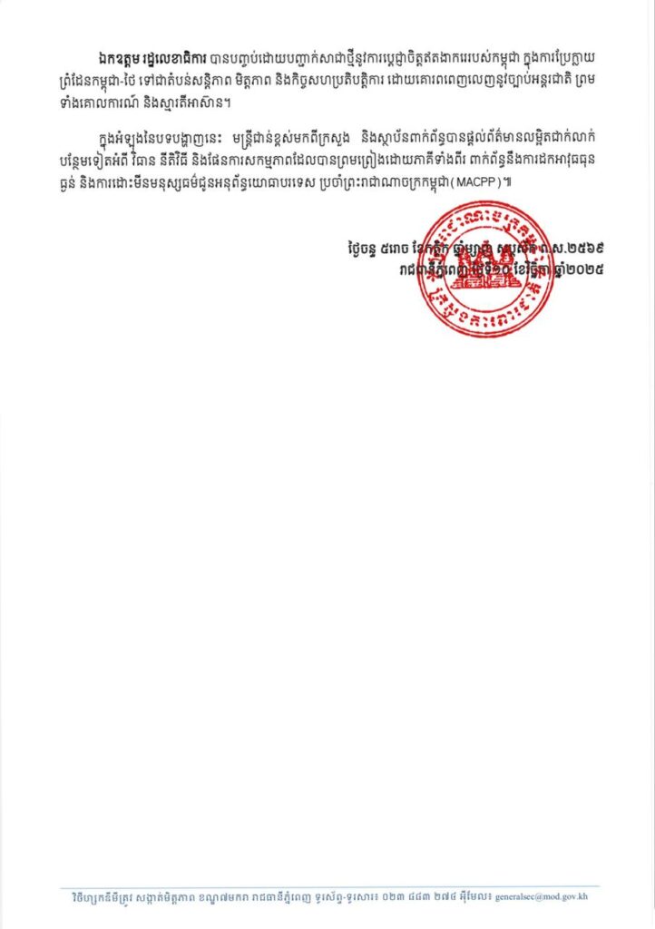 ឯកឧត្តម រដ្ឋលេខាធិការ បានបញ្ចប់ដោយបញ្ជាក់សាជាថ្មីនូវការប្ដេជ្ញាចិត្តឥតងាកររបស់កម្ពុជា ក្នុងការប្រែក្លាយ ព្រំដែនកម្ពុជា-ថៃ ទៅជាតំបន់សន្តិភាព មិត្តភាព និងកិច្ចសហប្រតិបត្តិការ ដោយគោរពពេញលេញនូវច្បាប់អន្តរជាតិ ព្រម ទាំងគោលការណ៍ និងស្មារតីអាស៊ាន។