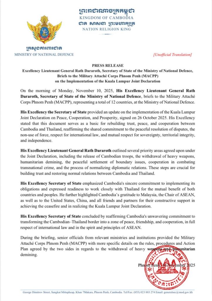 ឯកឧត្តម រដ្ឋលេខាធិការ បានជម្រាបជូនអំពីបច្ចុប្បន្នភាពនៃការអនុវត្តសេចក្តីថ្លែងការណ៍រួមទីក្រុងកូឡាឡាំពួរ ស្តីពីសន្តិភាព កិច្ចសហប្រតិបត្តិការ និងវិបុលភាព ដែលបានចុះហត្ថលេខានៅថ្ងៃទី២៦ ខែតុលា ឆ្នាំ២០២៥ ដែលជាមូលដ្ឋានគ្រឹះក្នុងការកសាងឡើងវិញនូវទំនុកចិត្ត សន្តិភាព និងកិច្ចសហប្រតិបត្តិការរវាងកម្ពុជា និងថៃ។