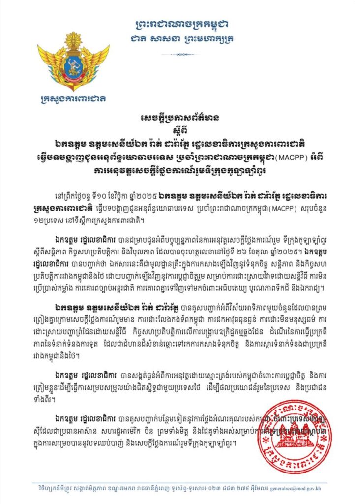 ក្រសួងការពារជាតិបានចេញសេចក្តីប្រកាសព័ត៌មានឲ្យដឹងថា នៅព្រឹកថ្ងៃចន្ទ ទី១០ ខែវិច្ឆិកា ឆ្នាំ២០២៥ ឯកឧត្តម ឧត្តមសេនីយ៍ឯក រ៉ាត់ ដារ៉ារ័ត្ន រដ្ឋលេខាធិការ ក្រសួងការពារជាតិ ធ្វើបទបង្ហាញជូនអនុព័ន្ធយោធាបរទេស ប្រចាំព្រះរាជាណាចក្រកម្ពុជា(MACPP) សរុបចំនួន ១២ប្រទេស នៅទីស្តីការក្រសួងការពារជាតិ។