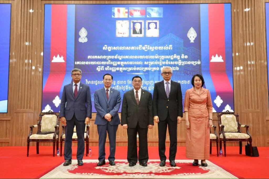 អគ្គលេខាធិការដ្ឋានរដ្ឋសភា សូមជម្រាបជូនសាធារណជនមេត្តាជ្រាបថា នាថ្ងៃចន្ទ ៥រោច ខែកត្តិក ឆ្នាំម្សាញ់ សប្ដស័ក ព.ស.២៥៦៩ ត្រូវនឹងថ្ងៃទី១០ ខែវិច្ឆិកា ឆ្នាំ២០២៥ រដ្ឋសភានៃព្រះរាជាណាចក្រកម្ពុជាសហការ ជាមួយក្រសួងសេដ្ឋកិច្ច និងហិរញ្ញវត្ថុ បានរៀបចំសិក្ខាសាលាស ដើម្បីស្វែងយល់ពីការកសាងក្របខ័ណ្ឌគោល នយោបាយម៉ាក្រូសេដ្ឋកិច្ច និងគោលនយោបាយហិរញ្ញវត្ថុសាធារណៈ ក្នុងការរៀបចំសេចក្តីព្រាងច្បាប់ស្តីពីហិរញ្ញវត្ថុ សម្រាប់ការគ្រប់គ្រងឆ្នាំ២០២៦” នៅវិមានរដ្ឋសភា ក្រោមអធិបតីភាព ឯកឧត្តមកិត្តិសេដ្ឋាបណ្ឌិត ជាម យៀប អនុប្រធាន ទី១ នៃរដ្ឋសភា និងជាតំណាងដ៏ខ្ពង់ខ្ពស់ សម្តេចមហារដ្ឋសភាធិការធិបតី ឃួន សុដារី ប្រធានរដ្ឋសភា ឯកឧត្តម បណ្ឌិត អ៊ុច បូររិទ្ធ អនុប្រធានទី១ ព្រឹទ្ធសភាតំណាងដ៏ខ្ពង់ខ្ពស់សម្តេចអគ្គមហាសេនាបតីតេជោ ហ៊ុន សែន ប្រធាន ព្រឹទ្ធសភា។