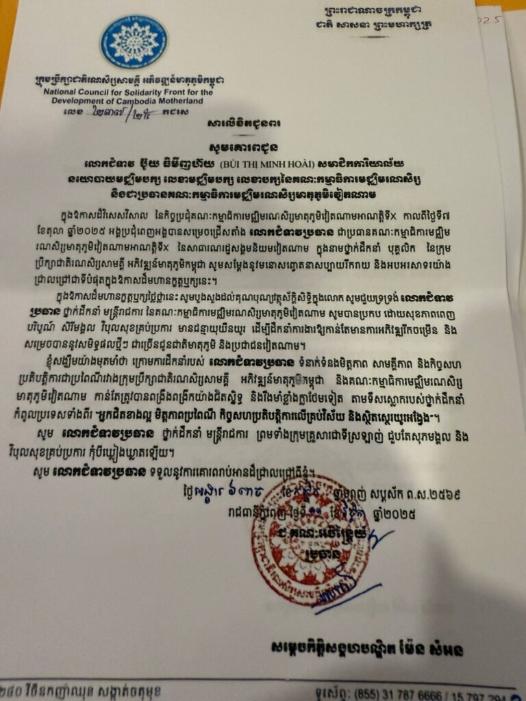 ក្នុងឱកាសដ៏វិសេសវិសាល នៃកិច្ចប្រជុំគណៈកម្មាធិការមជ្ឈិមរណសិរ្សមាតុភូមិវៀតណាមអាណត្តិទីX កាលពីថ្ងៃទី៧ ខែតុលា ឆ្នាំ២០២៥ អង្គប្រជុំពេញអង្គបានសម្រេចជ្រើសតាំង លោកជំទាវប្រធាន ជាប្រធានគណៈកម្មាធិការមជ្ឈិម រណសិរ្សមាតុភូមិវៀតណាមអាណត្តិទី៥ នៃសាធារណរដ្ឋសង្គមនិយមវៀតណាម ក្នុងនាមថ្នាក់ដឹកនាំ បុគ្គលិក នៃក្រុម ប្រឹក្សាជាតិរណសិរ្សសាមគ្គី អភិវឌ្ឍន៍មាតុភូមិកម្ពុជា សូមសម្ដែងនូវមនោសញ្ចេតនាសប្បាយរីករាយ និងអបអរសាទរយ៉ាងជ្រាលជ្រៅជាទីបំផុតក្នុងឱកាសដ៏មហានក្ខត្តឬក្សនេះ។