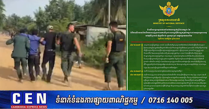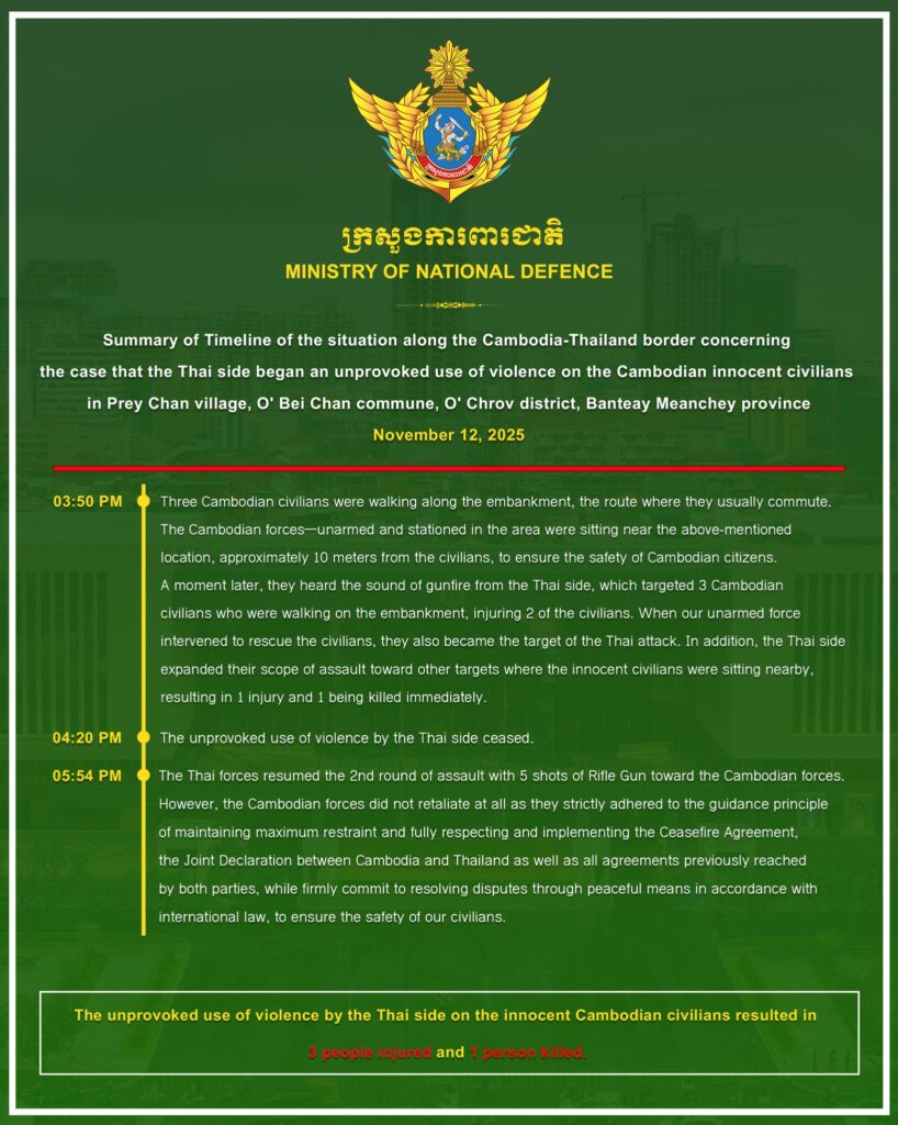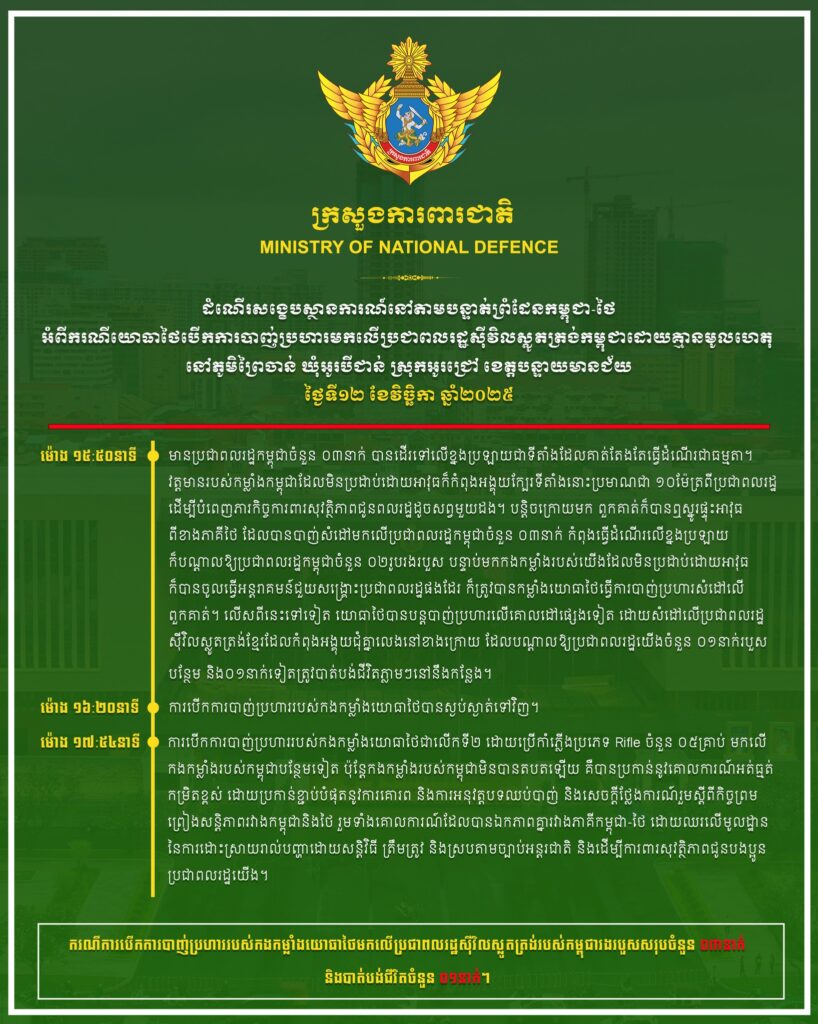 ភ្នំពេញ ៖ លោកជំទាវ ឧត្តមសេនីយ៍ឯក ម៉ាលី សុជាតា អ្នកនាំពាក្យក្រសួងការពារជាតិ នៃព្រះរាជាណាចក្រកម្ពុជា សូមជម្រាបជូនសាធារណជន អ្នកសារព័ត៌មានជាតិ និងអន្តរជាតិមេត្តាជ្រាប៖ ដំណើរសង្ខេបស្ថានការណ៍នៅតាមបន្ទាត់ព្រំដែនកម្ពុជា-ថៃ អំពី ករណីយោធាថៃបើក ការបាញ់ប្រហារមកលើប្រជាពលរដ្ឋស៊ីវិលស្លូតត្រង់កម្ពុជាដោយគ្មានមូលហេតុ នៅភូមិព្រៃចាន់ ឃុំអូរបីជាន់ ស្រុកអូរជ្រៅ ខេត្តបន្ទាយមានជ័យ៕ រក្សាសិទ្ធដោយ៖សុទ្ធលី