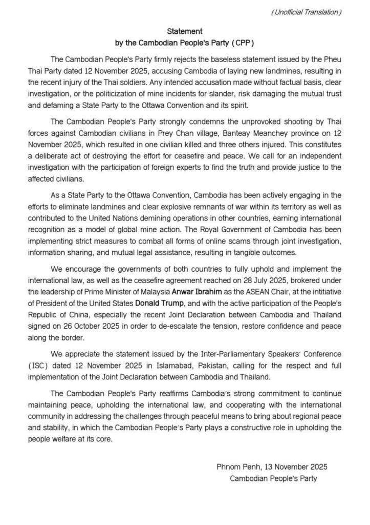 ភ្នំពេញ ៖ គណបក្សប្រជាជនកម្ពុជា ច្រានចោលទាំងស្រុងនូវសេចក្តីថ្លែងការណ៍របស់គណបក្សភឿថៃ កាលពីថ្ងៃទី១២ ខែវិច្ឆិកា ឆ្នាំ២០២៥ ដែលបានចោទប្រកាន់កម្ពុជាដោយគ្មានមូលដ្ឋាន ថាបានដាក់មីនថ្មី ដែលបានបណ្តាលឱ្យកងទ័ពថៃរបួសកាលពីពេលថ្មីៗនេះ។ ចេតនាចោទប្រកាន់ណាមួយដែលគ្មានការពិត ការស៊ើបអង្កេតច្បាស់លាស់ ឬការប្រើប្រាស់បញ្ហាផ្ទះមីន ដើម្បីមួលបង្កាច់នយោបាយអាចនឹងបំផ្លាញដល់ទំនុកចិត្តរវាងគ្នានិងគ្នាធ្វើឱ្យអាប់អោនដល់កិត្តិយសរបស់រដ្ឋភាគី និងស្មារតីនៃអនុសញ្ញាអូតាវា។