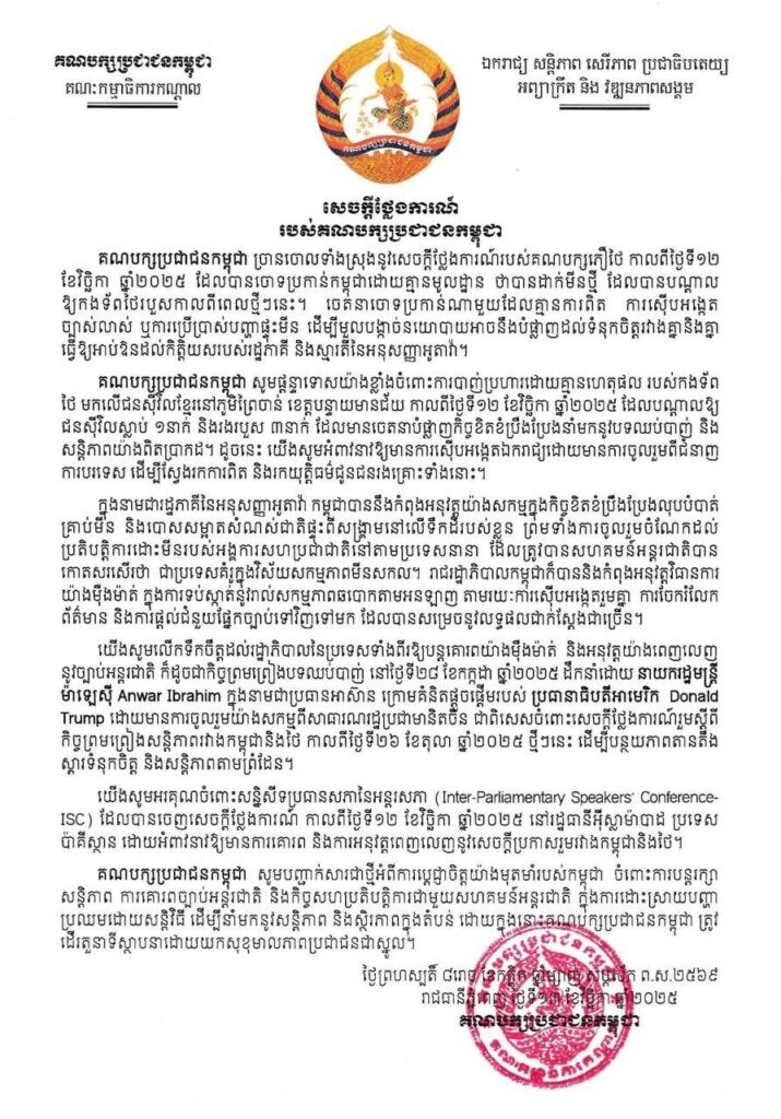 គណបក្សប្រជាជនកម្ពុជា សូមផ្តន្ទាទោសយ៉ាងខ្លាំងចំពោះការបាញ់ប្រហារដោយគ្មានហេតុផល របស់កងទ័ពថៃ មកលើជនស៊ីវិលខ្មែរនៅភូមិព្រៃចាន់ ខេត្តបន្ទាយមានជ័យ កាលពីថ្ងៃទី១២ ខែវិច្ឆិកា ឆ្នាំ២០២៥ ដែលបណ្តាលឱ្យ ជនស៊ីវិលស្លាប់ ១នាក់ និងរងរបួស ៣នាក់ ដែលមានចេតនាបំផ្លាញកិច្ចខិតខំប្រឹងប្រែងនាំមកនូវបទឈប់បាញ់ និង សន្តិភាពយ៉ាងពិតប្រាកដ។ ដូចនេះ យើងសូមអំពាវនាវឱ្យមានការស៊ើបអង្កេតឯករាជ្យដោយមានការចូលរួមពីជំនាញ ការបរទេស ដើម្បីស្វែងរកការពិត និងរកយុត្តិធម៌ជូនជនរងគ្រោះទាំងនោះ។