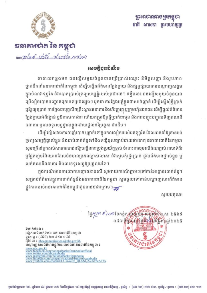 នៅថ្ងៃទី១៤ ខែវិច្ឆិកា ឆ្នាំ២០២៥ ធនាគារជាតិ នៃ កម្ពុជាបានចេញសេចក្តីជូនដំណឹងឲ្យដឹងថា នាពេលកន្លងមក ជនល្មើសមួយចំនួនបានប្រើប្រាស់ឈ្មោះ និមិត្តសញ្ញា និងរូបភាព ថ្នាក់ដឹកនាំធនាគារជាតិនៃកម្ពុជា ដើម្បីបង្កើតព័ត៌មានក្លែងក្លាយ និងផ្សព្វផ្សាយតាមបណ្តាញសង្គម ក្នុងបំណងទុច្ចរិត និងបោកប្រាស់ទ្រព្យសម្បត្តិរបស់ប្រជាជន។