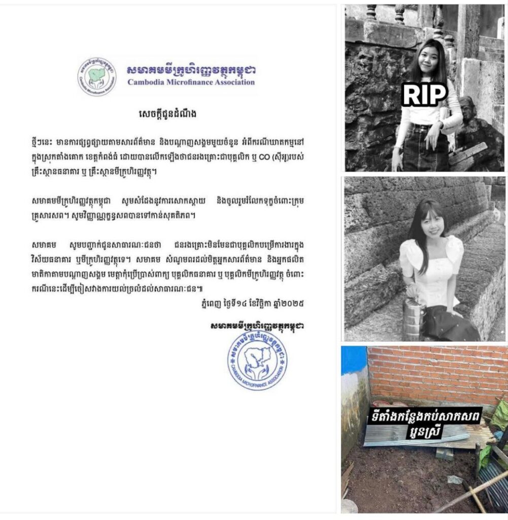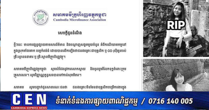 ភ្នំពេញ ៖ សមាគមមីក្រូហិរញ្ញវត្ថុកម្ពុជា នៅថ្ងៃទី១៤ខែវិច្ឆិកានេះ បានចេញសេចក្តីប្រកាសព័ត៌មានឲ្យដឹងថា ថ្មីៗនេះ មានការផ្សព្វផ្សាយតាមសារព័ត៌មាន និងបណ្ដាញសង្គមមួយចំនួន អំពីករណីឃាតកម្មនៅក្នុងស្រុកតាំងគោក ខេត្តកំពង់ធំ ដោយបានលើកឡើងថាជនរងគ្រោះជាបុគ្គលិក ឬ CO (ស៊ីអូ)របស់គ្រឹះស្ថានធនាគារ ឬ គ្រឹះស្ថានមីក្រូហិរញ្ញវត្ថុ ។