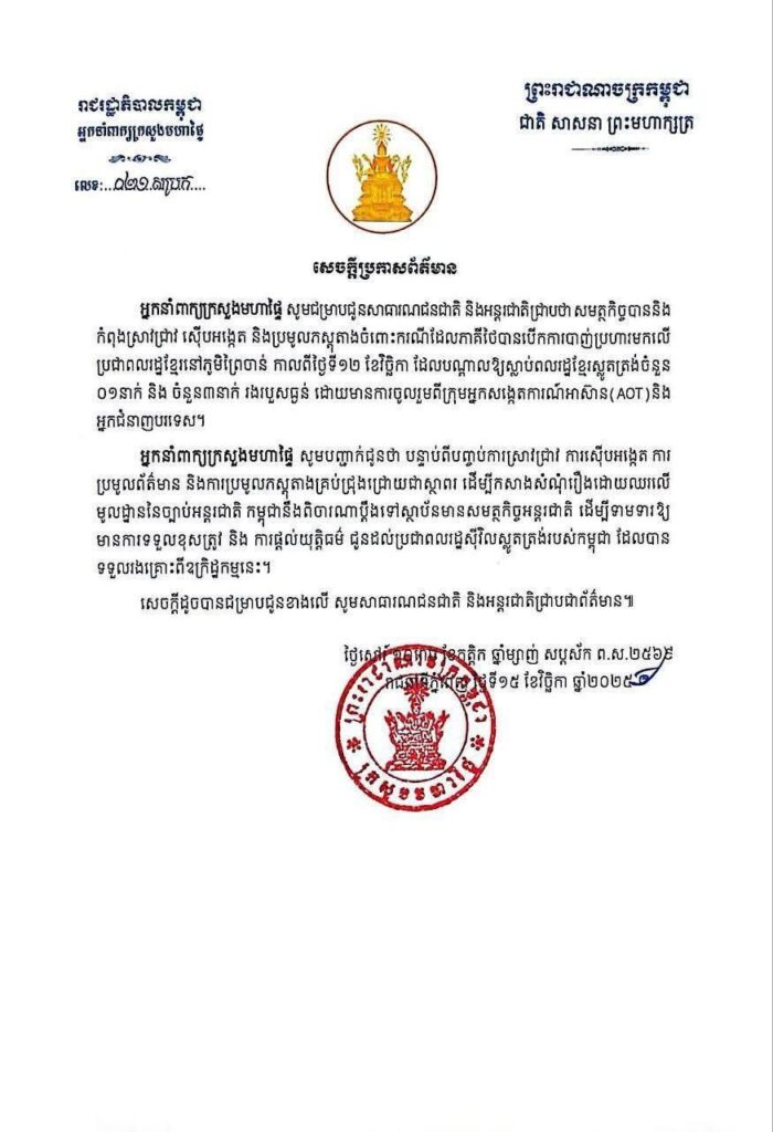 នៅរសៀលថ្ងៃទី១៥ ខែវិច្ឆិកា ឆ្នាំ២០២៥នេះ អ្នកនាំពាក្យក្រសួងមហាផ្ទៃ បានជូនដំណឹងដល់សាធារណជនជាតិ និងអន្តរជាតិជ្រាបថា សមត្ថកិច្ចបាននិងកំពុងស្រាវជ្រាវ ស៊ើបអង្កេត និងប្រមូលភស្តុតាងចំពោះករណីដែលភាគីថៃបានបើកការបាញ់ប្រហារមកលើប្រជាពលរដ្ឋខ្មែរនៅភូមិព្រៃចាន់ កាលពីថ្ងៃទី១២ ខែវិច្ឆិកា ដែលបណ្ដាលឱ្យស្លាប់ពលរដ្ឋខ្មែរស្លូតត្រង់ចំនួន០១នាក់ និង ចំនួន៣នាក់ រងរបួសធ្ងន់ ដោយមានការចូលរួមពីក្រុមអ្នកសង្កេតការណ៍អាស៊ាន (AOT) និងអ្នកជំនាញបរទេស។