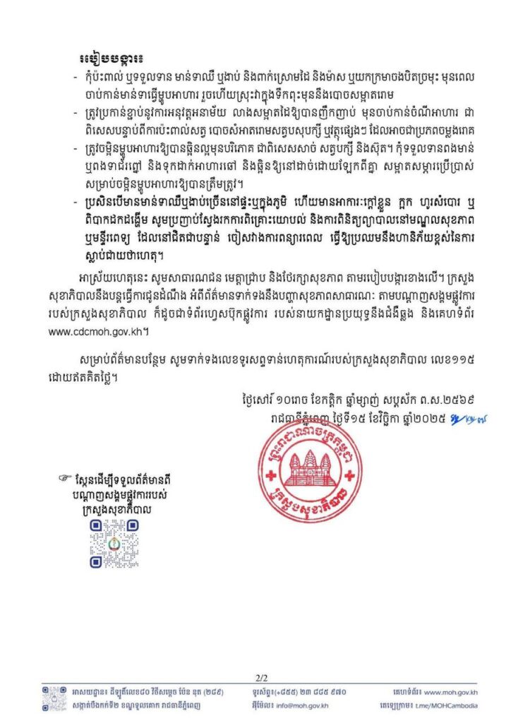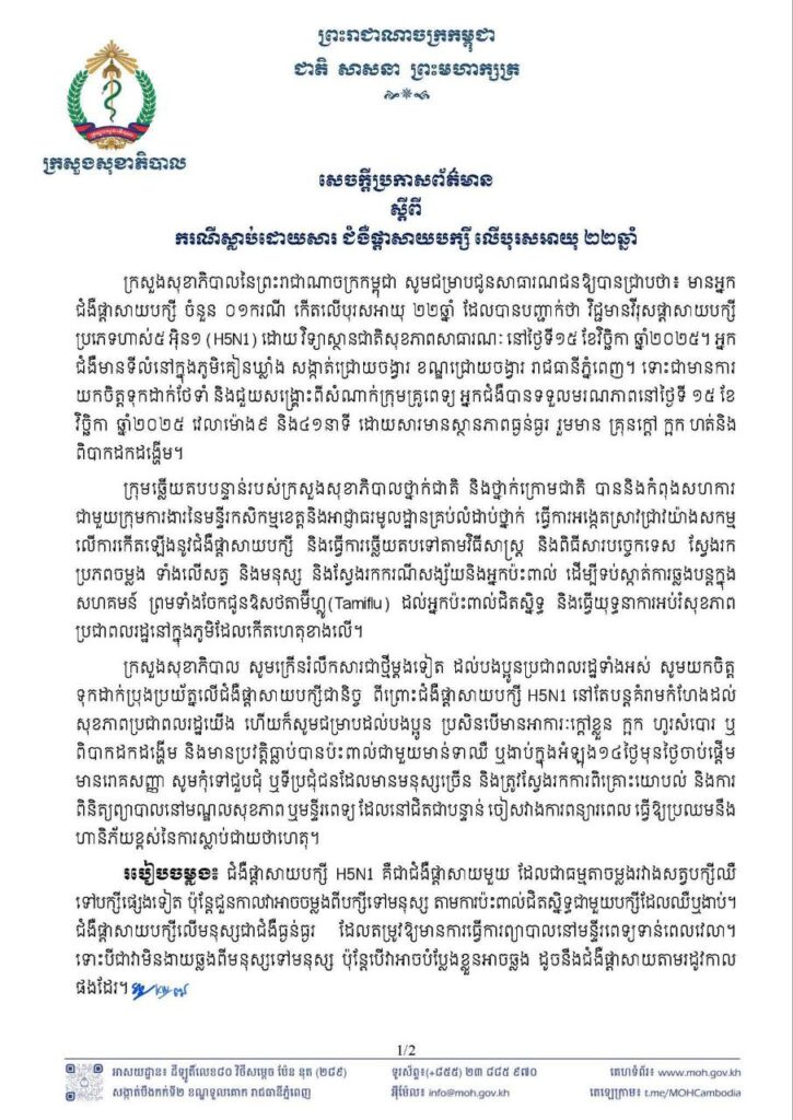 ភ្នំពេញ ៖ក្រសួងសុខាភិបាលនៃព្រះរាជាណាចក្រកម្ពុជា សូមជម្រាបជូនសាធារណជនឱ្យបានជ្រាបថា៖ មានអ្នកជំងឺផ្តាសាយបក្សី ចំនួន ០១ករណី កើតលើបុរសអាយុ ២២ឆ្នាំ ដែលបានបញ្ជាក់ថា វិជ្ជមានវីរុសផ្តាសាយបក្សី ប្រភេទហាស់៥ អ៊ុន១ (H5N1) ដោយ វិទ្យាស្ថានជាតិសុខភាពសាធារណៈ នៅថ្ងៃទី១៥ ខែវិច្ឆិកា ឆ្នាំ២០២៥។ អ្នក ជំងឺមានទីលំនៅក្នុងភូមិគៀនឃ្លាំង សង្កាត់ជ្រោយចង្វារ ខណ្ឌជ្រោយចង្វារ រាជធានីភ្នំពេញ។ ទោះជាមានការ យកចិត្តទុកដាក់ថែទាំ និងជួយសង្គ្រោះពីសំណាក់ក្រុមគ្រូពេទ្យ អ្នកជំងឺបានទទួលមរណភាពនៅថ្ងៃទី ១៥ ខ វិច្ឆិកា ឆ្នាំ២០២៥ វេលាម៉ោង៩ និង៤១នាទី ដោយសារមានស្ថានភាពធ្ងន់ធ្ងរ រួមមាន គ្រុនក្តៅ ក្អក ហត់និង ពិបាកដកដង្ហើម។
