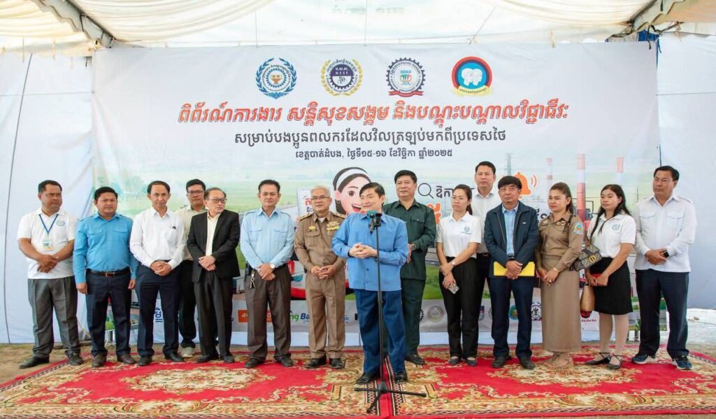 បាត់ដំបង ៖ ឯកឧត្ដម ហេង សួរ រដ្ឋមន្ត្រីក្រសួងការងារ និងបណ្ដុះបណ្ដាលវិជ្ជាជីវៈ បានបន្តអញ្ជើញជាអធិបតីក្នុងពិធីបើកពិព័រណ៍ការងារ សន្តិសុខសង្គម និងបណ្តុះបណ្តាលវិជ្ជាជីវៈ សម្រាប់បងប្អូនអតីតពលករដែលត្រឡប់មកពីប្រទេសថៃ ដោយនាំយកឱកាសការងារប្រមាណជាង ១,១ម៉ឺនកន្លែង និងព័ត៌មានស្តីពីអត្ថប្រយោជន៍នៃរបបសន្តិសុខសង្គម (ប.ស.ស.) និងការបណ្តុះបណ្តាលជំនាញបច្ចេកទេស និងវិជ្ជាជីវៈដោយឥតគិតថ្លៃ នៅព្រឹកថ្ងៃទី១៦ ខែវិច្ឆិកា ឆ្នាំ២០២៥នេះ នៅទីធ្លាសាធារណៈឃុំគារ ស្រុកមោងឫស្សី ខេត្តបាត់ដំបង ដែលរៀបចំដោយទីភ្នាក់ងារជាតិមុខរបរ និងការងារ (NEA) នៃក្រសួងការងារ និងបណ្តុះបណ្តាលវិជ្ជាជីវៈ រដ្ឋបាលស្រុកមោងឫស្សី សហភាពសហព័ន្ធយុវជនកម្ពុជា ខេត្តបាត់ដំបង វិស័យឯកជន សមាគមមិត្តយើង អ្នកផ្តល់ការអប់រំបណ្តុះបណ្តាល និងដៃគូពាក់ព័ន្ធផ្សេងទៀត ដែលមានអ្នកចូលរួម ១ ២០០នាក់។