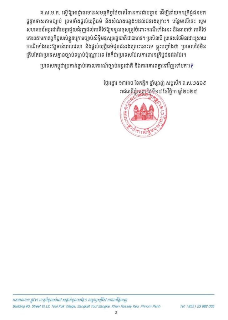 បន្ថែមពីនេះ កងទ័ពកម្ពុជាចំនួន១៨នាក់ កំពុងស្ថិតនៅក្រោមការឃុំខ្លួនខុសច្បាប់ពីសំណាក់យោធាថៃ ដោយគិតត្រឹមថ្ងៃទី១៨ ខែវិច្ឆិកា ឆ្នាំ២០២៥ មានរយៈពេល១១២ ថ្ងៃហើយ ដែលផ្ទុយនឹងខ្លឹមសារនៃសេចក្តីប្រកាសរួម ថ្ងៃទី២៦ ខែតុលា ឆ្នាំ២០២៥។ ព្រឹត្តិការណ៍នៅថ្ងៃទី១២ ខែវិច្ឆិកា ឆ្នាំ២០២៥ ទាហានថៃបើកការវាយប្រហារដោយគ្មានមូលហេតុមកលើ ប្រជាជនកម្ពុជាស្លូតត្រង់ បណ្តាលឱ្យស្លាប់និងរបួស ហើយរាប់រយគ្រួសារទៀតត្រូវបង្ខំចិត្តចាកចេញពីផ្ទះ សម្បែងទាំងយប់។ ហេតុការណ៍ថ្មីៗនេះ ពលករចំណាកស្រុកជាស្ត្រីខ្មែរម្នាក់ អាយុ ១៨ឆ្នាំ ត្រូវបាន ទាហានឈុតខ្មៅថៃ៧នាក់ ចាប់រំលោភបូកយ៉ាងព្រៃផ្សៃ នៅពេលដែលត្រឡប់ពីប្រទេសថៃមកកម្ពុជាវិញ នាយប់ថ្ងៃទី១៥ ខែវិច្ឆិកា ឆ្នាំ២០២៥។
