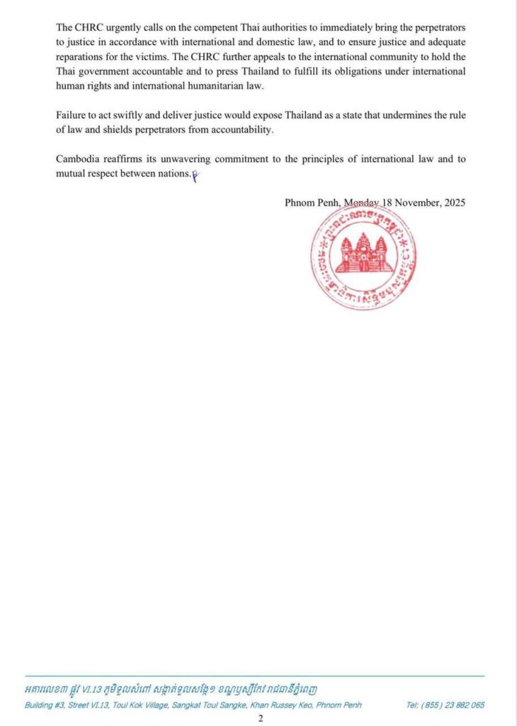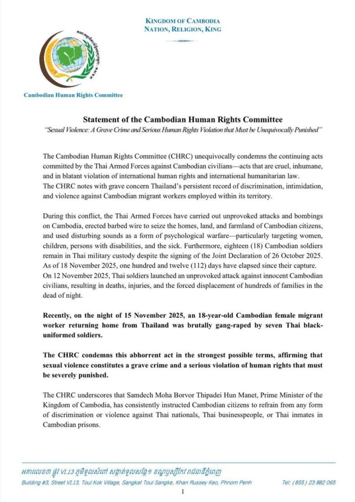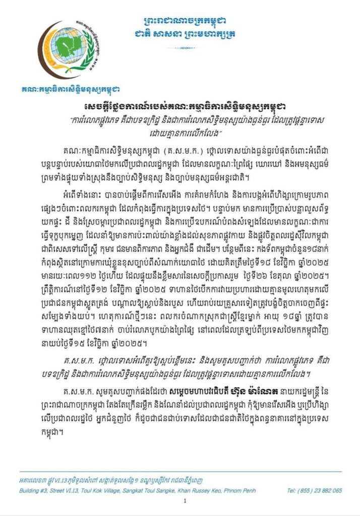 ភ្នំពេញ ៖ នៅថ្ងៃទី១៨ ខែវិច្ឆិកា ឆ្នាំ២០២៥គណៈកម្មាធិការសិទ្ធិមនុស្សកម្ពុជា (គ.ស.ម.ក.) ថ្កោលទោសយ៉ាងធ្ងន់ធ្ងរបំផុតចំពោះអំពើជា បន្តបន្ទាប់របស់យោធាថៃមកលើប្រជាពលរដ្ឋកម្ពុជា ដែលមានលក្ខណៈព្រៃផ្សៃ ឃោរឃៅ និងអមនុស្សធម៌ ព្រមទាំងផ្ទុយទាំងស្រុងនឹងច្បាប់សិទ្ធិមនុស្ស និងច្បាប់មនុស្សធម៌អន្តរជាតិ។