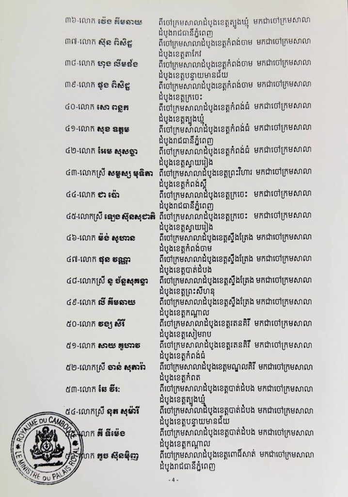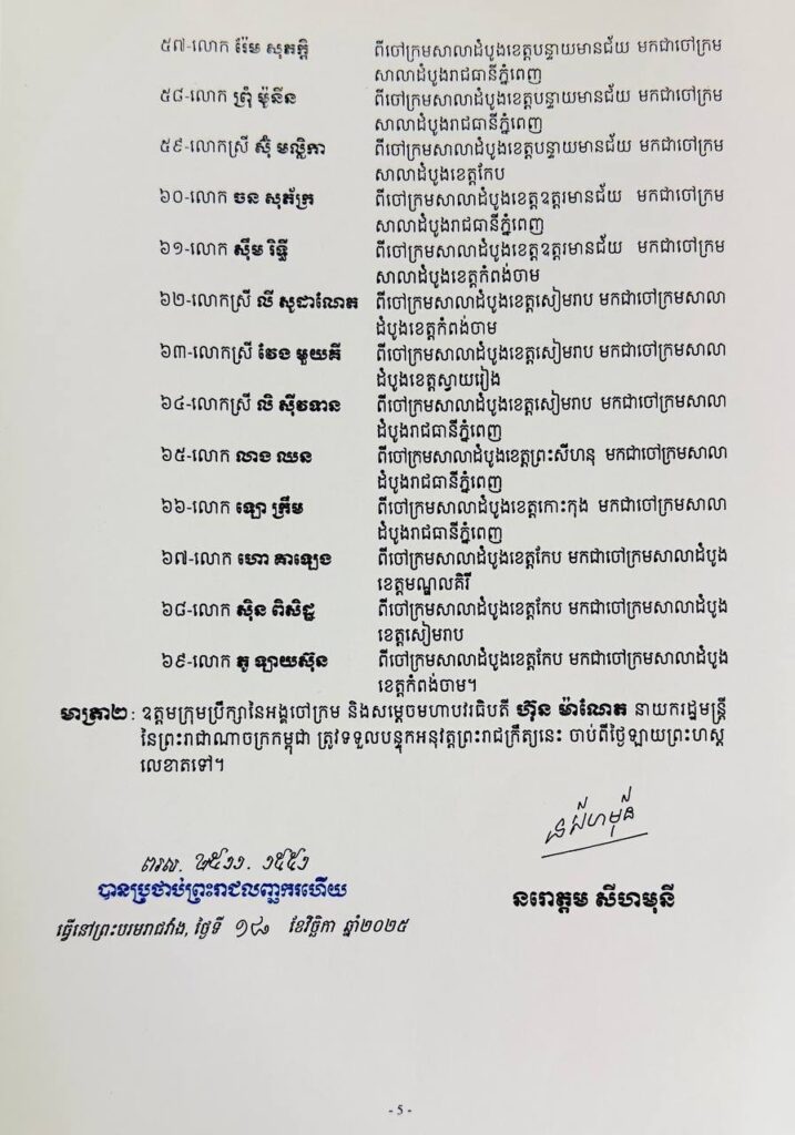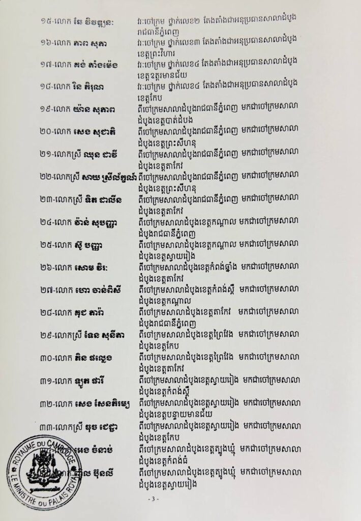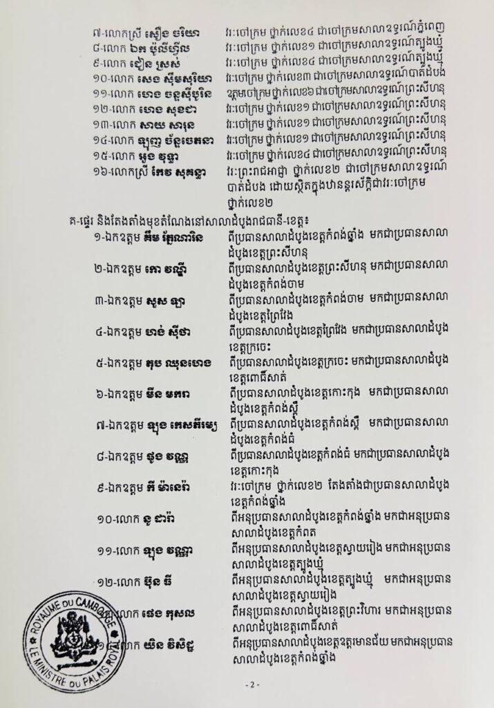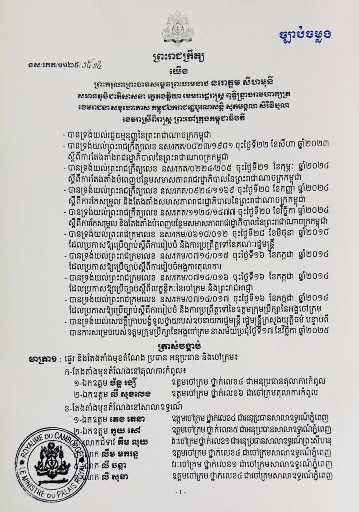 ភ្នំពេញ៖ នៅរសៀលថ្ងៃទី១៨ ខែវិច្ឆិកា ឆ្នាំ២០២៥ ព្រះមហាក្សត្រចេញព្រះរាជក្រឹត្យ ផ្ទេរ និងតែងតាំងមុខតំណែង ប្រធាន អនុប្រធាន និងចៅក្រម៖