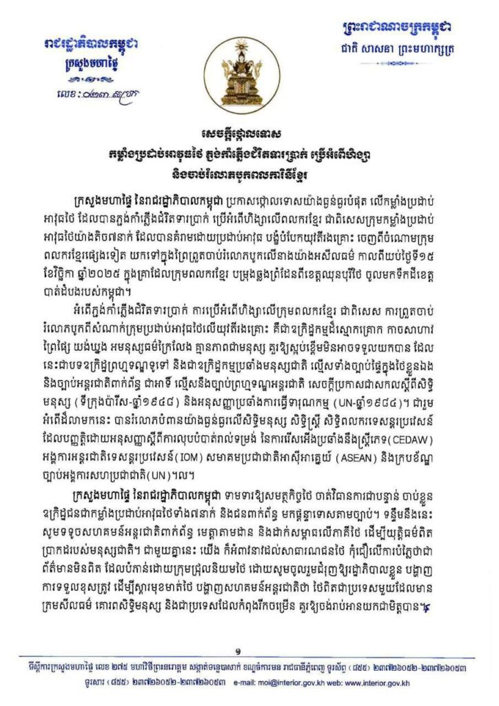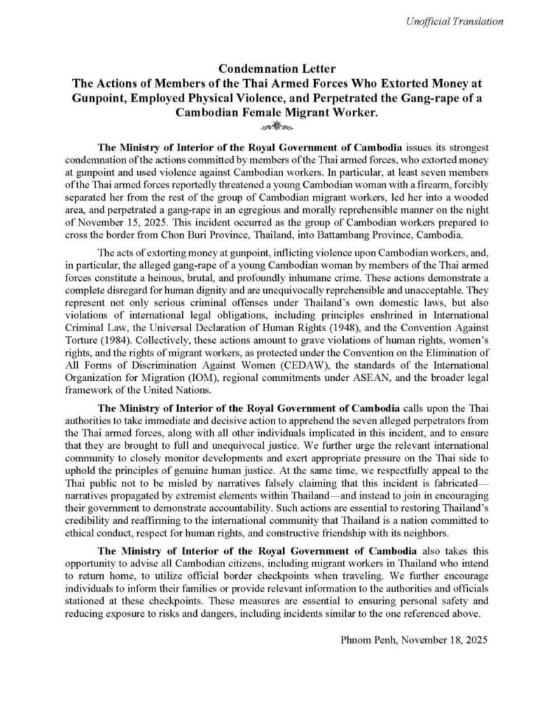 ក្រសួងមហាផ្ទៃ នៃរាជរដ្ឋាភិបាលកម្ពុជា ប្រកាសថ្កោលទោសយ៉ាងធ្ងន់ធ្ងរបំផុត លើកម្លាំងប្រដាប់ អាវុធថៃ ដែលបានភ្ជង់កាំភ្លើងជំរិតទារប្រាក់ ប្រើអំពើហិង្សាលើពលករខ្មែរ ជាពិសេសក្រុមកម្លាំងប្រដាប់ អាវុធថៃយ៉ាងតិច៧នាក់ ដែលបានគំរាមដោយប្រដាប់អាវុធ បង្ខំបំបែកយុវតីរងគ្រោះ ចេញពីចំណោមក្រុម ពលករខ្មែរផ្សេងទៀត យកទៅក្នុងព្រៃព្រួតចាប់រំលោភបូកលើនាងយ៉ាងអសីលធម៌ កាលពីយប់ថ្ងៃទី១៥ ខែវិច្ឆិកា ឆ្នាំ២០២៥ ក្នុងគ្រាដែលក្រុមពលករខ្មែរ បម្រុងឆ្លងព្រំដែនពីខេត្តឈុនបុរីថៃ ចូលមកទឹកដីខេត្ត បាត់ដំបងរបស់កម្ពុជា។