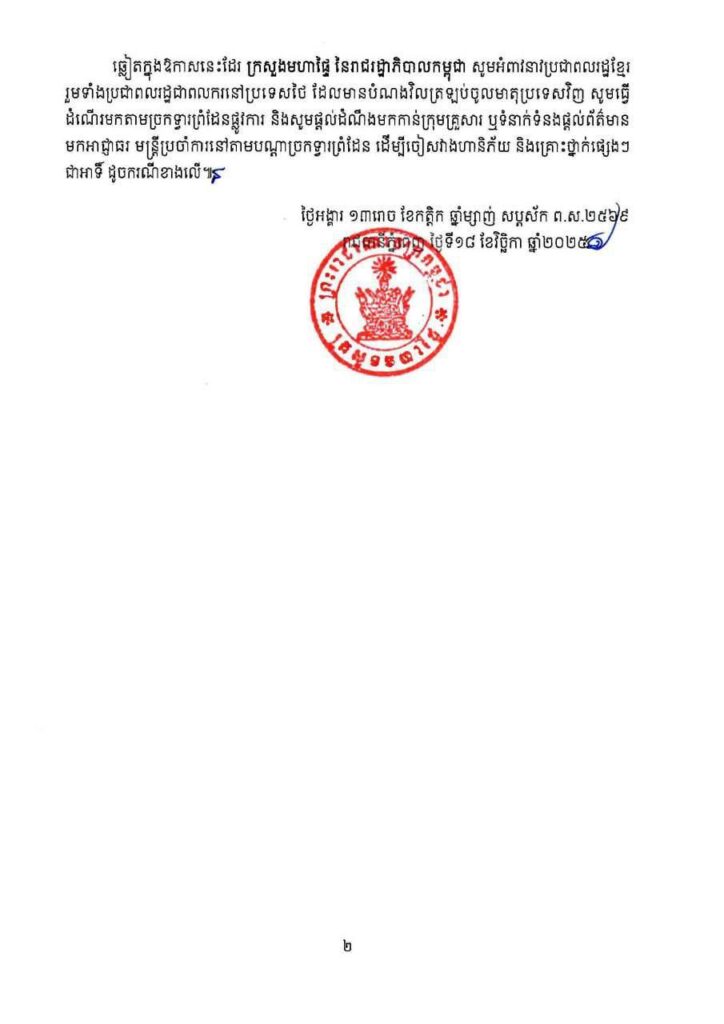ឆ្លៀតក្នុងឱកាសនេះដែរ ក្រសួងមហាផ្ទៃ នៃរាជរដ្ឋាភិបាលកម្ពុជា សូមអំពាវនាវប្រជាពលរដ្ឋខ្មែរ រួមទាំងប្រជាពលរដ្ឋជាពលករនៅប្រទេសថៃ ដែលមានបំណងវិលត្រឡប់ចូលមាតុប្រទេសវិញ សូមធ្វើ ដំណើរមកតាមច្រកទ្វារព្រំដែនផ្លូវការ និងសូមផ្ដល់ដំណឹងមកកាន់ក្រុមគ្រួសារ ឬទំនាក់ទំនងផ្តល់ព័ត៌មាន មកអាជ្ញាធរ មន្ត្រីប្រចាំការនៅតាមបណ្តាច្រកទ្វារព្រំដែន ដើម្បីចៀសវាងហានិភ័យ និងគ្រោះថ្នាក់ផ្សេងៗ ជាអាទិ៍ ដូចករណីខាងលើ៕រក្សាសិទ្ធដោយ៖សុទ្ធលី