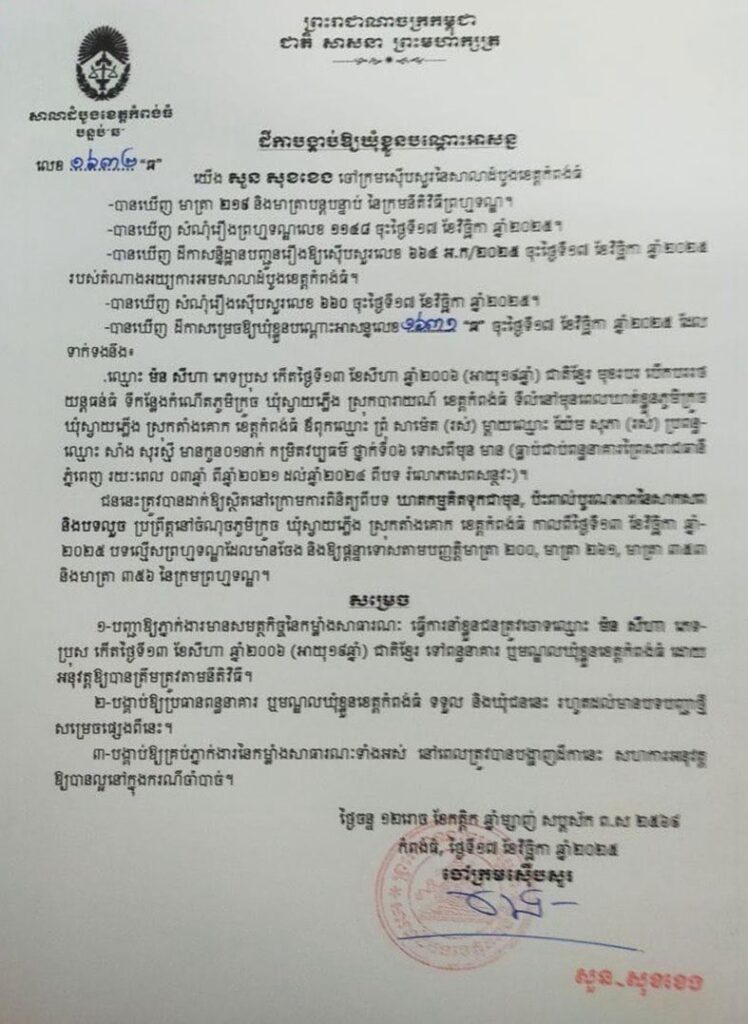 បទល្មើសដែលមានបញ្ញត្តិឱ្យផ្តន្ទាទោស តាមមាត្រា ២០០, មាត្រា ២៦១,មាត្រា ៣៥៣ និងមាត្រា ៣៥៦ នៃក្រមព្រហ្មទណ្ឌ ប្រព្រឹត្តនៅភូមិក្រូច ឃុំស្វាយភ្លើង ស្រុកតាំងគោក ខេត្តកំពង់ធំ កាលពីថ្ងៃទី១៣ ខែវិច្ឆិកា ឆ្នាំ២០២៥។