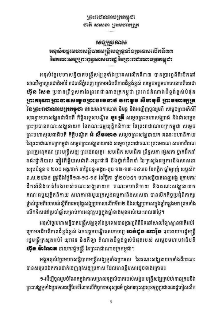 ភ្នំពេញ ៖ គណៈសង្ឃនាយកនៃព្រះរាជាណាចក្រកម្ពុជា នៅថ្ងៃទី១៩ ខែវិច្ឆិកា ឆ្នាំ២០២៥ បានចេញសង្ឃប្រកាស អនុសំវច្ឆរមហាសន្និបាតមន្ត្រីសង្ឃទូទាំងប្រទេស លើកទី៣៣ នៃគណៈសង្ឃព្រះពុទ្ធសាសនារដ្ឋនៃព្រះរាជាណាចក្រកម្ពុជា។