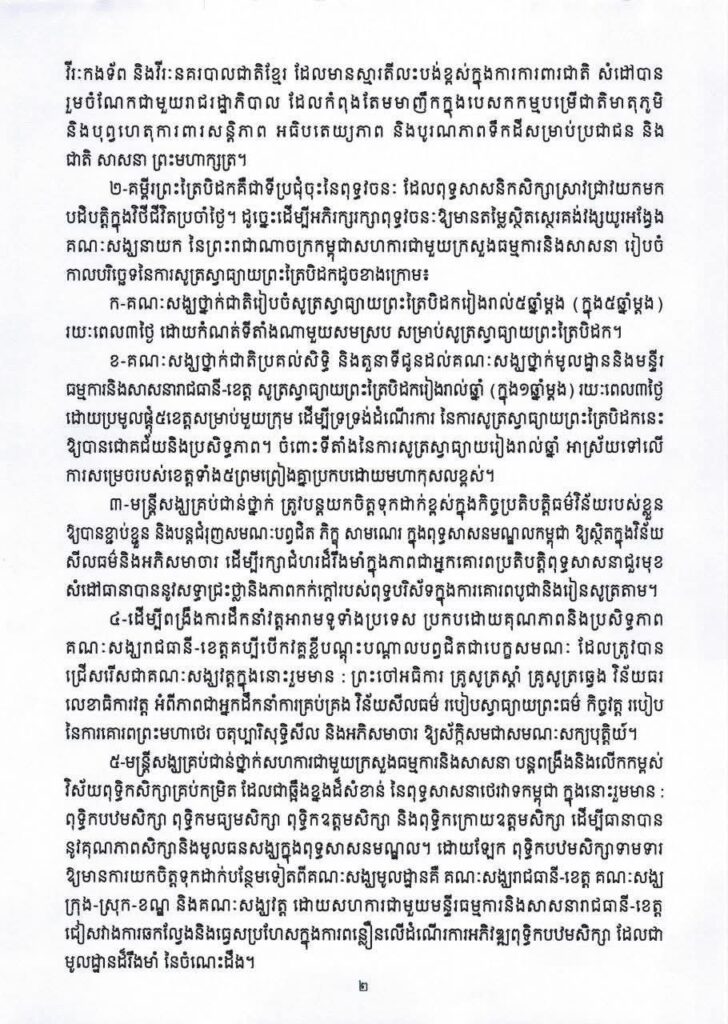 ៤-ដើម្បីពង្រឹងការដឹកនាំវត្តអារាមទូទាំងប្រទេស ប្រកបដោយគុណភាពនិងប្រសិទ្ធភាព គណៈសង្ឃរាជធានី-ខេត្តគប្បីបើកវគ្គខ្លីបណ្តុះបណ្តាលបព្វជិតជាបេក្ខសមណៈ ដែលត្រូវបាន ជ្រើសរើសជាគណៈសង្ឃវត្តក្នុងនោះរួមមាន : ព្រះចៅអធិការ គ្រូសូត្រស្តាំ គ្រូសូត្រឆ្វេង វិន័យធរ លេខាធិការវត្ត អំពីភាពជាអ្នកដឹកនាំការគ្រប់គ្រង វិន័យសីលធម៌ របៀបស្វាធ្យាយព្រះធម៌ កិច្ចវត្ត របៀប នៃការគោរពព្រះមហាថេរ ចតុប្បារិសុទ្ធិសីល និងអភិសមាចារ ឱ្យស័ក្កិសមជាសមណៈសក្យបុត្ដិយ៍។ ៥-មន្ត្រីសង្ឃគ្រប់ជាន់ថ្នាក់សហការជាមួយក្រសួងធម្មការនិងសាសនា បន្តពង្រឹងនិងលើកកម្ពស់ វិស័យពុទ្ធិកសិក្សាគ្រប់កម្រិត ដែលជាឆ្អឹងខ្នងដ៏សំខាន់ នៃពុទ្ធសាសនាថេរវាទកម្ពុជា ក្នុងនោះរួមមាន : ពុទ្ធិកបឋមសិក្សា ពុទ្ធិកមធ្យមសិក្សា ពុទ្ធិកឧត្តមសិក្សា និងពុទ្ធិកក្រោយឧត្តមសិក្សា ដើម្បីធានាបាន នូវគុណភាពសិក្សានិងមូលធនសង្ឃក្នុងពុទ្ធសាសនមណ្ឌល។ ដោយឡែក ពុទ្ធិកបឋមសិក្សាទាមទារ ឱ្យមានការយកចិត្តទុកដាក់បន្ថែមទៀតពីគណៈសង្ឃមូលដ្ឋានគឺ គណៈសង្ឃរាជធានី-ខេត្ត គណៈសង្ឃ ក្រុង-ស្រុក-ខណ្ឌ និងគណៈសង្ឃវត្ត ដោយសហការជាមួយមន្ទីរធម្មការនិងសាសនារាជធានី-ខេត្ត