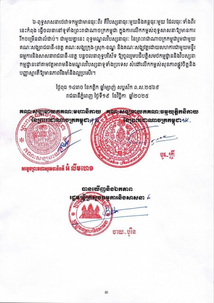 អង្គអនុសំវច្ឆរមហាសន្និបាតមន្ត្រីសង្ឃទូទាំងប្រទេស នៃគណៈសង្ឃនាយកទាំងពីរគណៈបានសម្រេចឯកភាពដាក់ចេញនូវសង្ឃប្រកាស ដែលមានខ្លឹមសារដូចខាងក្រោម៖