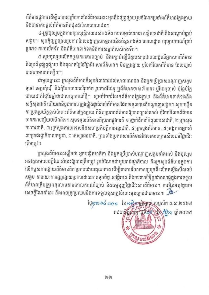 ២-ត្រូវចូលរួមលើកកម្ពស់សីលធម៌សង្គម និងគោរពក្រមសីលធម៌នៅក្នុងការផលិត និងផ្សាយព័ត៌មាន លើបណ្តាញសង្គម។ ត្រូវចៀសវាងការផ្សាយ ឬចែករំលែកព័ត៌មានដែលបង្កភាពចលាចល ការញុះញង់ឱ្យ មានអំពើអសកម្ម អំពើអសីលធម៌ក្នុងសង្គម ឬប៉ះពាល់ដល់អារម្មណ៍របស់ប្រជាពលរដ្ឋ សន្តិភាព សន្តិសុខជាតិ សណ្តាប់ធ្នាប់សាធារណៈ សុខដុមនីយកម្មសង្គម និងជាតិសាសន៍។