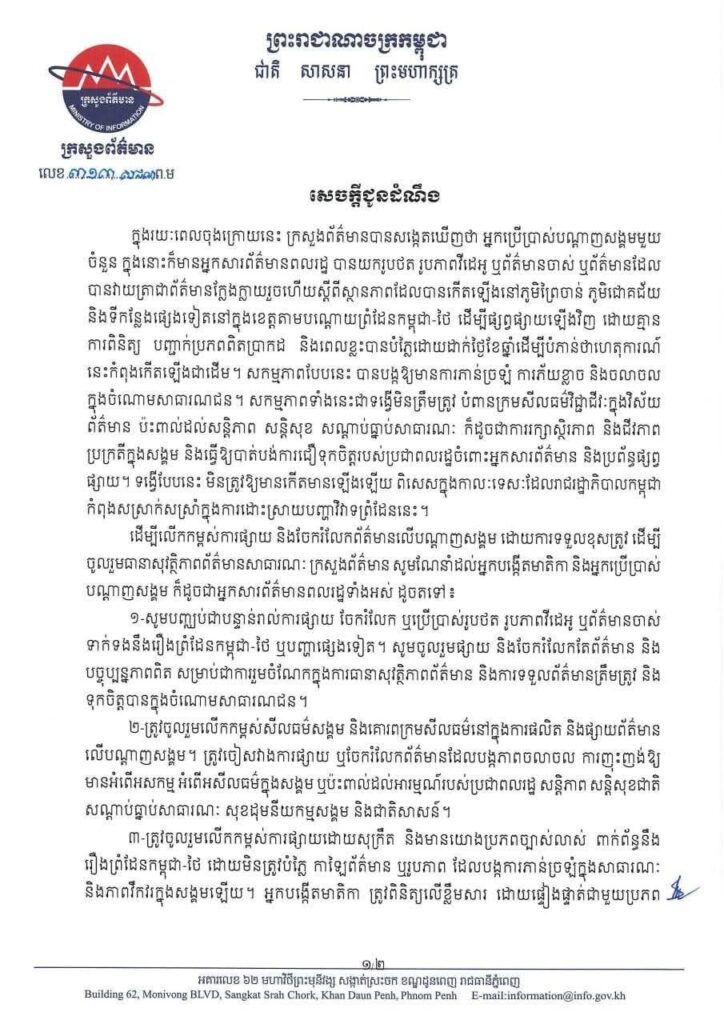 ភ្នំពេញ ៖ក្នុងរយៈពេលចុងក្រោយនេះ ក្រសួងព័ត៌មានបានសង្កេតឃើញថា អ្នកប្រើប្រាស់បណ្តាញសង្គមមួយចំនួន ក្នុងនោះក៏មានអ្នកសារព័ត៌មានពលរដ្ឋ បានយករូបថត រូបភាពវីដេអូ ឬព័ត៌មានចាស់ ឬព័ត៌មានដែលបានវាយត្រាជាព័ត៌មានក្លែងក្លាយរួចហើយស្តីពីស្ថានភាព ដែលបានកើតឡើងនៅភូមិព្រៃចាន់ ភូមិជោគជ័យ និងទីកន្លែងផ្សេងទៀតនៅក្នុងខេត្តតាមបណ្តោយព្រំដែនកម្ពុជា-ថៃ ដើម្បីផ្សព្វផ្សាយឡើងវិញ ដោយគ្មានការពិនិត្យ បញ្ជាក់ប្រភពពិតប្រាកដ និងពេលខ្លះបានបំភ្លៃដោយដាក់ថ្ងៃខែឆ្នាំដើម្បីបំភាន់ថាហេតុការណ៍នេះកំពុងកើតឡើងជាដើម។ សកម្មភាពបែបនេះ បានបង្កឱ្យមានការភាន់ច្រឡំ ការភ័យខ្លាច និងចលាចលក្នុងចំណោមសាធារណជន។