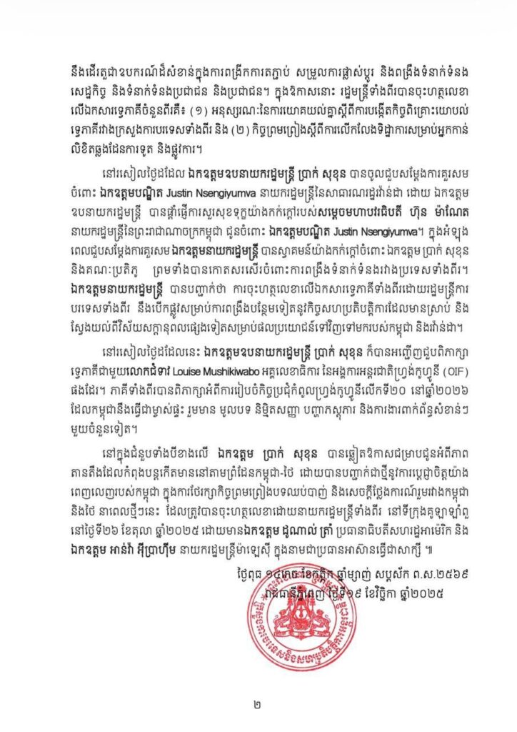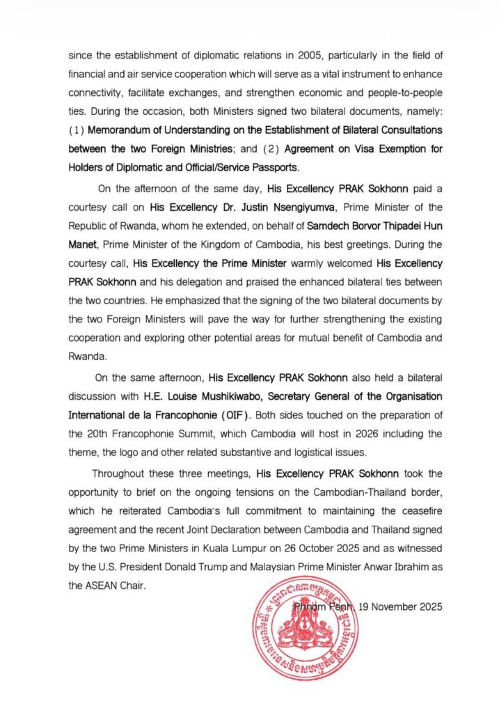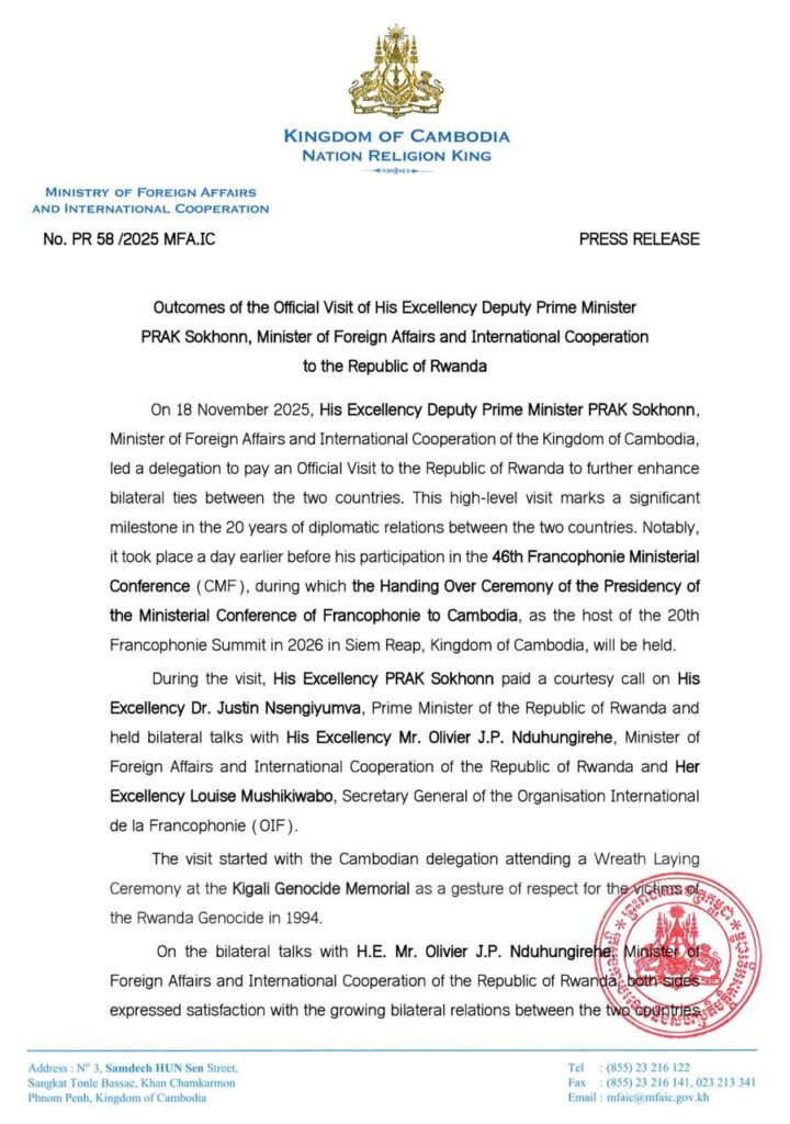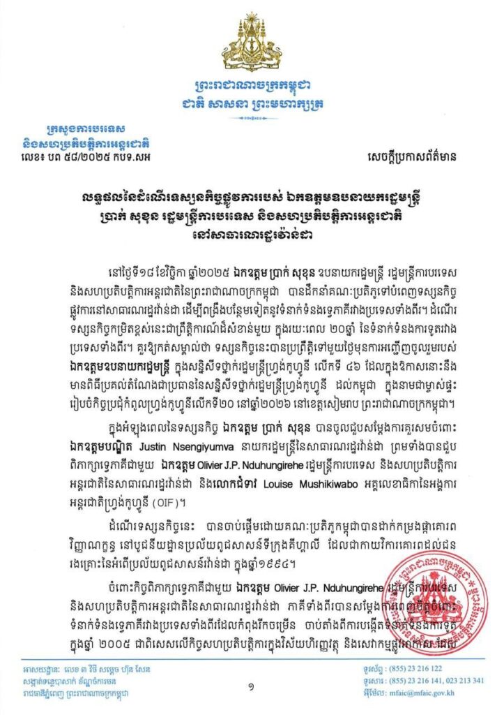 បានចេញសេចក្តីប្រកាសព័ត៌មានលទ្ធផលនៃដំណើរទស្សនកិច្ចផ្លូវការរបស់ ឯកឧត្តមឧបនាយករដ្ឋមន្តី ប្រាក់ សុខុន រដ្ឋមន្ត្រីការបរទេស និងសហប្រតិបត្តិការអន្តរជាតិ នៅសាធារណរដ្ឋរវ៉ន់ដា។
