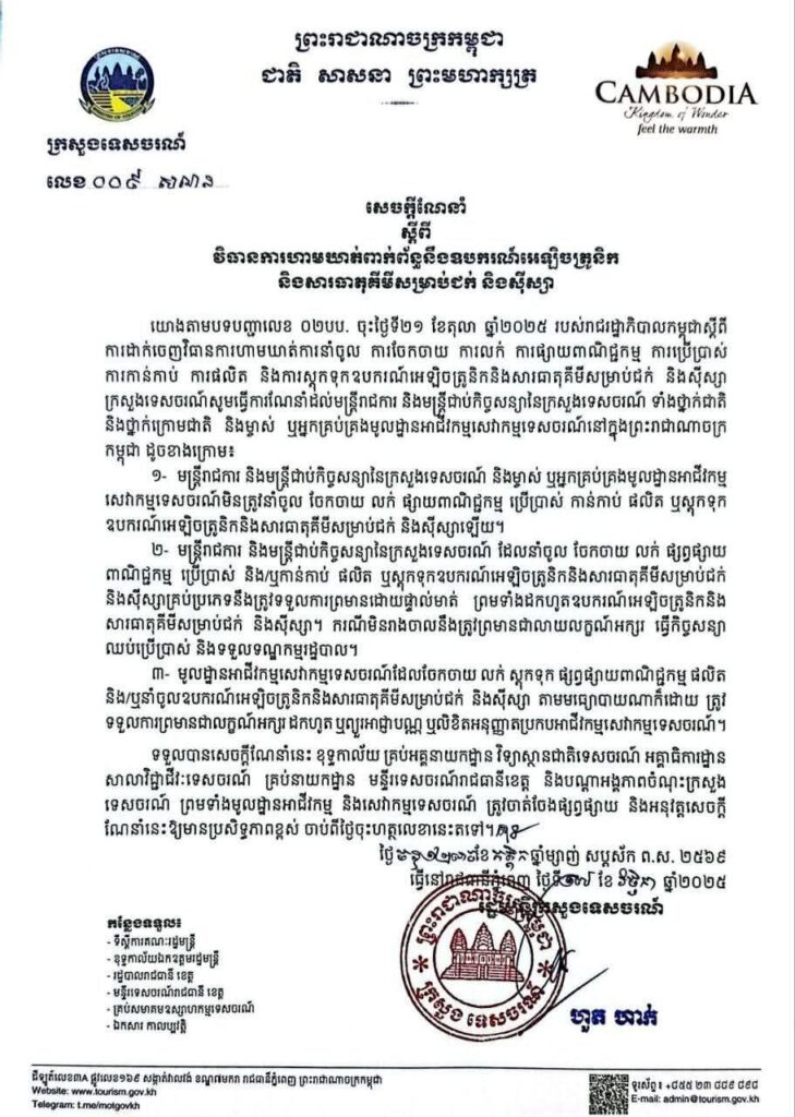 ភ្នំពេញ ៖ យោងតាមបទបញ្ជាលេខ ០២បប. ចុះថ្ងៃទី២១ ខែតុលា ឆ្នាំ២០២៥ របស់រាជរដ្ឋាភិបាលកម្ពុជាស្តីពី ការដាក់ចេញវិធានការហាមឃាត់ការនាំចូល ការចែកចាយ ការលក់ ការផ្សាយពាណិជ្ជកម្ម ការប្រើប្រាស់ ការកាន់កាប់ ការផលិត និងការស្ដុកទុកឧបករណ៍អេឡិចត្រូនិកនិងសារធាតុគីមីសម្រាប់ជក់ និងស៊ីស្សា ក្រសួងទេសចរណ៍សូមធ្វើការណែនាំដល់មន្ត្រីរាជការ និងមន្ត្រីជាប់កិច្ចសន្យានៃក្រសួងទេសចរណ៍ ទាំងថ្នាក់ជាតិ និងថ្នាក់ក្រោមជាតិ និងម្ចាស់ ឬអ្នកគ្រប់គ្រងមូលដ្ឋានអាជីវកម្មសេវាកម្មទេសចរណ៍នៅក្នុងព្រះរាជាណាចក្រកម្ពុជា ដូចខាងក្រោម៖