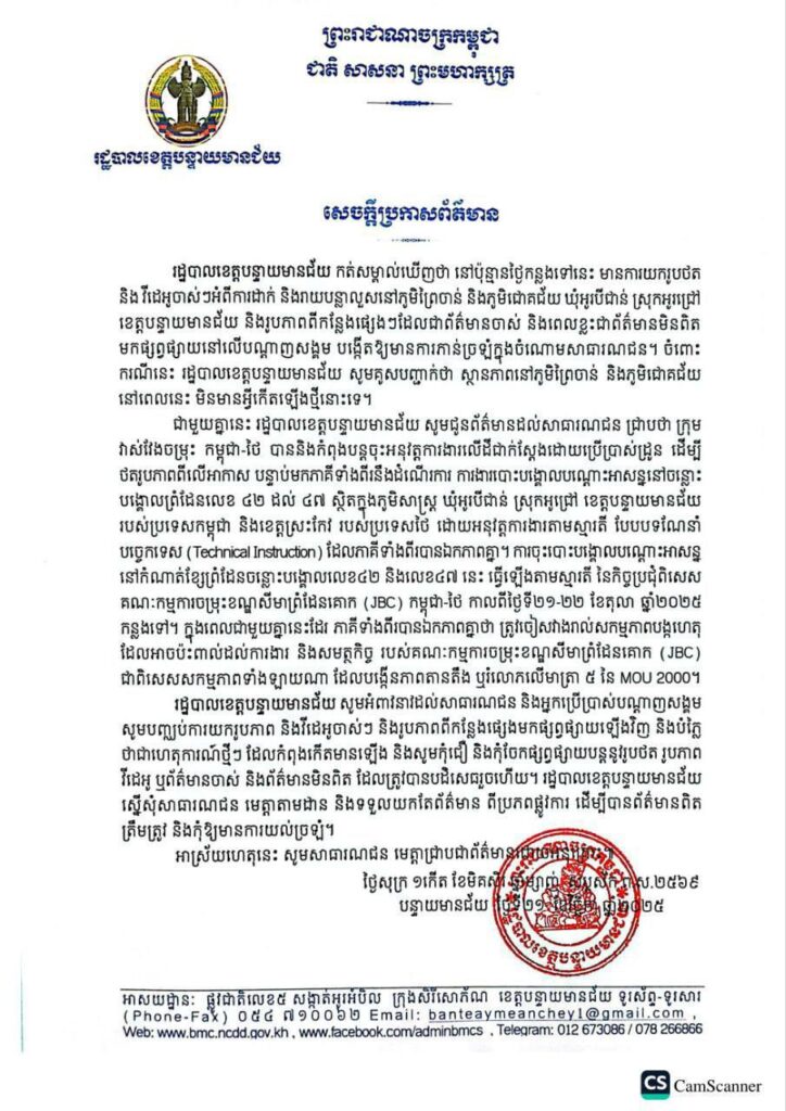 ជាមួយគ្នានេះ រដ្ឋបាលខេត្តបន្ទាយមានជ័យ សូមជូនព័ត៌មានដល់សាធារណជន ជ្រាបថា ក្រុម វាស់វែងចម្រុះ កម្ពុជា-ថៃ បាននិងកំពុងបន្តចុះអនុវត្តការងារលើដីជាក់ស្ដែងដោយប្រើប្រាស់ដូន ដើម្បី ថតរូបភាពពីលើអាកាស បន្ទាប់មកភាគីទាំងពីរនឹងដំណើរការ ការងារបោះបង្គោលបណ្តោះអាសន្ននៅចន្លោះ បង្គោលព្រំដែនលេខ ៤២ ដល់ ៤៧ ស្ថិតក្នុងភូមិសាស្ត្រ ឃុំអូរបីជាន់ ស្រុកអូជ្រៅ ខេត្តបន្ទាយមានជ័យ របស់ប្រទេសកម្ពុជា និងខេត្តស្រះកែវ របស់ប្រទេសថៃ ដោយអនុវត្តការងារតាមស្មារតី បែបបទណែនាំ បច្ចេកទេស (Technical Instruction) ដែលភាគីទាំងពីរបានឯកភាពគ្នា។ ការចុះបោះបង្គោលបណ្តោះអាសន្ន នៅកំណាត់ខ្សែព្រំដែនចន្លោះបង្គោលលេខ៤២ និងលេខ៤៧ នេះ ធ្វើឡើងតាមស្មារតី នៃកិច្ចប្រជុំពិសេស គណៈកម្មការចម្រុះខណ្ឌសីមាព្រំដែនគោក (JBC) កម្ពុជា-ថៃ កាលពីថ្ងៃទី២១-២២ ខែតុលា ឆ្នាំ២០២៥ កន្លងទៅ។ ក្នុងពេលជាមួយគ្នានេះដែរ ភាគីទាំងពីរបានឯកភាពគ្នាថា ត្រូវចៀសវាងរាល់សកម្មភាពបង្កហេតុ ដែលអាចប៉ះពាល់ដល់ការងារ និងសមត្ថកិច្ច របស់គណៈកម្មការចម្រុះខណ្ឌសីមាព្រំដែនគោក (JBC) ជាពិសេសសកម្មភាពទាំងឡាយណា ដែលបង្កើនភាពតានតឹង ឬរំលោភលើមាត្រា ៥ នៃ MOU 2000។