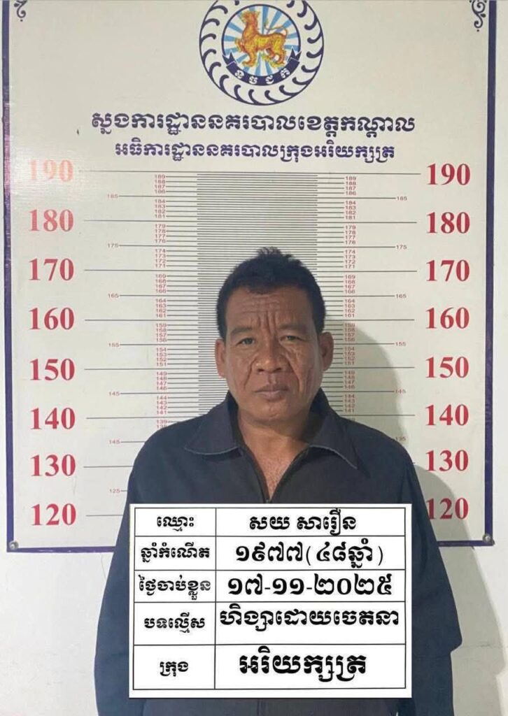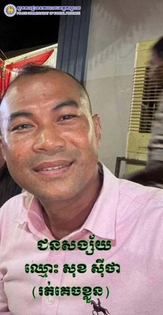 ជនសង្ស័យ ចំនួន ០៥នាក់ (ឃាត់ខ្លួនបាន ០៤នាក់) ៖ ១.ឈ្មោះ សុខ ស៊ីថា ភេទប្រុស អាយុ៤៦ឆ្នាំ ជនជាតិខ្មែរ មុខរបរកសិករ មានទីលំនៅបច្ចុប្បន្នភូមិបឹងក្រចាប់ជើង ឃុំព្រែកតាមាក់ ស្រុកខ្សាច់កណ្តាល ខេត្ដកណ្ដាល (ជនដៃដល់) (គេចខ្លួន)។ ២.ឈ្មោះ សយ សារឿន ភេទប្រុស អាយុ៤៨ឆ្នាំ ជនជាតិខ្មែរ មុខរបរកសិករ មានទីលំនៅបច្ចុប្បន្នភូមិតាជោ សង្កាត់សារិកាកែវ ក្រុងអរិយក្សត្រ ខេត្ដកណ្ដាល ឃាត់ខ្លួន តេស្តទឹកនោមរកសារធាតុញៀនលទ្ធផលអវិជ្ជមាន (-)។