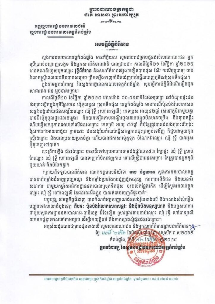 ពាក់ព័ន្ធនឹងករណីខាងលើនេះ នៅថ្ងៃទី ២២ ខែវិច្ឆិកា ឆ្នាំ២០២៥ ស្នងការនគរបាលខេត្តកំពង់ឆ្នាំងសូមជម្រាបជូនដល់សាធារណៈជន អ្នកប្រើប្រាស់បណ្តាញសង្គម និងអ្នកសារព័ត៌មានជាតិ បានជ្រាបថាៈ កាលពីថ្ងៃទី២១ ខែវិច្ឆិកា ឆ្នាំ២០២៥ មានគណនីហ្វេសបុកនិងសារព័ត៌មានផ្សេងៗទៀតបានផុស ស៊ែរ ករណីគ្រូពេទ្យ ចាប់ រំលោភស្រ្តីពេលយប់មិនបានសម្រេច ព្រឹកឡើងទាញកាំបិតដេញកាប់ផ្អើលពេញភូមិនៅស្រុកទឹកផុស។ ក្នុងនាមអ្នកនាំពាក្យ នៃស្នងការដ្ឋាននគរបាលខេត្តកំពង់ឆ្នាំង សូមធ្វើការបំភ្លឺពីដំណើររឿងជូន សាធារណៈជន ដូចខាងក្រោមៈ