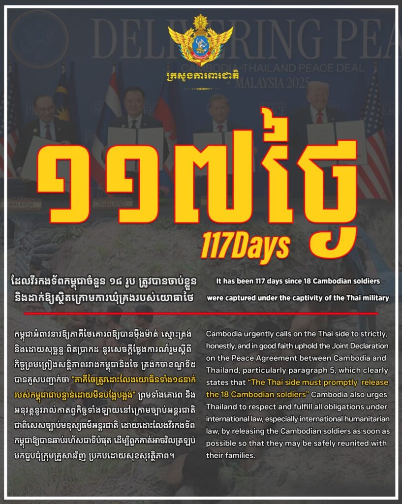 ភ្នំពេញ ៖ ក្រសួងការពារជាតិ បានឲ្យដឹងថា កម្ពុជាអំពាវនាវឱ្យភាគីថៃគោរពឱ្យបានម៉ឺងម៉ាត់ ស្មោះត្រង់ និងដោយសុច្ឆន្ទៈពិតប្រាកដ នូវសេចក្តីថ្លែងការណ៍រួមស្តីពីកិច្ចព្រមព្រៀងសន្តិភាពរវាងកម្ពុជានិងថៃ ត្រង់កថាខណ្ឌទី៥ បានគូសបញ្ជាក់ថា “ភាគីថៃត្រូវដោះលែងយោធិនទាំង១៨នាក់របស់កម្ពុជាជាបន្ទាន់ដោយមិនបង្អែបង្អង់” ព្រមទាំងគោរពនិងអនុវត្តនូវរាល់កាតព្វកិច្ចទាំងឡាយនៅក្រោមច្បាប់អន្តរជាតិ ជាពិសេសច្បាប់មនុស្សធម៌អន្តរជាតិ ដោយដោះលែងវីរកងទ័ពកម្ពុជាឱ្យបានឆាប់រហ័សជាទីបំផុត ដើម្បីពួកគាត់អាចវិលត្រឡប់មកជួបជុំក្រុមគ្រួសារវិញ ប្រកបដោយសុខសុវត្ថិភាព។