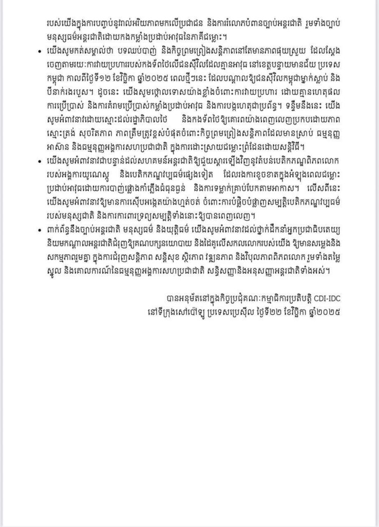 កិច្ចព្រមព្រៀងសន្តិភាព ហើយស្នើឱ្យភាគីទាំងពីរគោរពនិងអនុវត្តកិច្ចព្រមព្រៀងទាំងនេះដោយស្មោះត្រង់ ស្របតាមលក្ខខណ្ឌ និងគោលបំណងនៃកិច្ចព្រមព្រៀង។ ក្នុងន័យនេះ យើងសូមជំរុញឱ្យមានការដោះគ្រាប់ និងយុទ្ធភណ្ឌមិនទាន់ផ្ទុះ (UXO) ជាពិសេសគ្រាប់បែកចង្កោម និងសំណល់គ្រាប់សង្គ្រាមផ្សេងទៀត ដើម្បី ស្ដារស្ថានភាពសង្គម វប្បធម៌ និងសេដ្ឋកិច្ចរបស់ប្រជាជនដែលរស់នៅក្នុងតំបន់រងផលប៉ះពាល់ឱ្យវិលមករក ប្រក្រតីភាពឡើងវិញ ការពារសុវត្ថិភាព និងសន្តិសុខជូនដល់ប្រជាជនដោយផ្អែកលើមូលដ្ឋានមនុស្សធម៌។ យើងសូមអំពាវនាវឱ្យមានការដោះលែងជាបន្ទាន់និងដោយគ្មានលក្ខខណ្ឌ ទាហានកម្ពុជាចំនួន ១៨នាក់ ដែលត្រូវបានកងទ័ពថៃចាប់ខ្លួនដោយខុសច្បាប់ នៅថ្ងៃទី២៩ ខែកក្កដា ឆ្នាំ២០២៥ ក្រោយបទឈប់បាញ់ ចូលជាធរមាននៅថ្ងៃទី២៨ ខែកក្កដា ឆ្នាំ២០២៥។ យើងមានជំនឿជឿជាក់យ៉ាងមុតមាំថា នេះជាកាតព្វកិច្ចរបស់យើងក្នុងការបញ្ចប់នូវរាល់អរិយភាពមកលើប្រជាជន និងការរំលោភបំពានច្បាប់អន្តរជាតិ រួមទាំងច្បាប់ មនុស្សធម៌អន្តរជាតិដោយកងកម្លាំងប្រដាប់អាវុធនៃភាគីជម្លោះ។