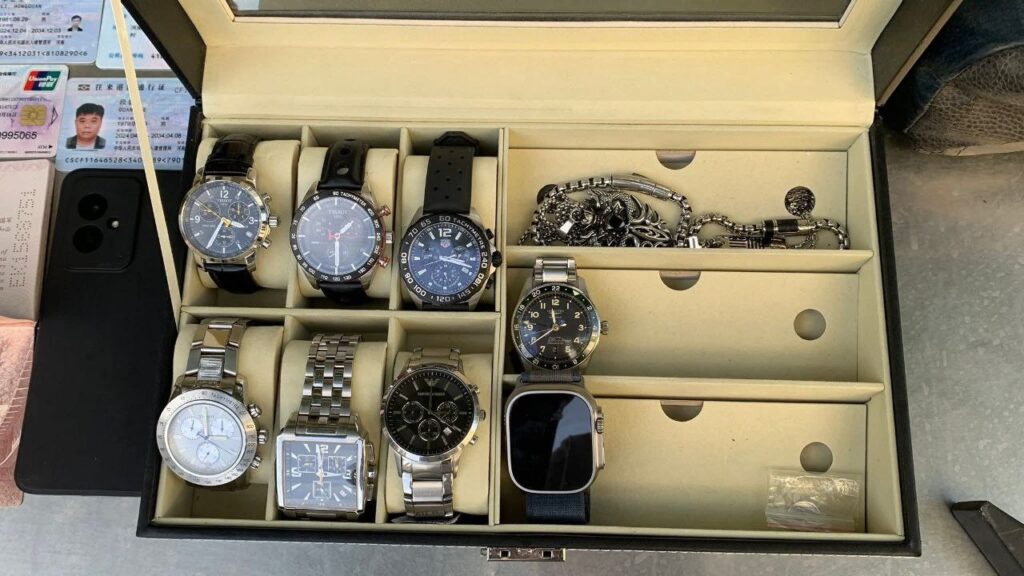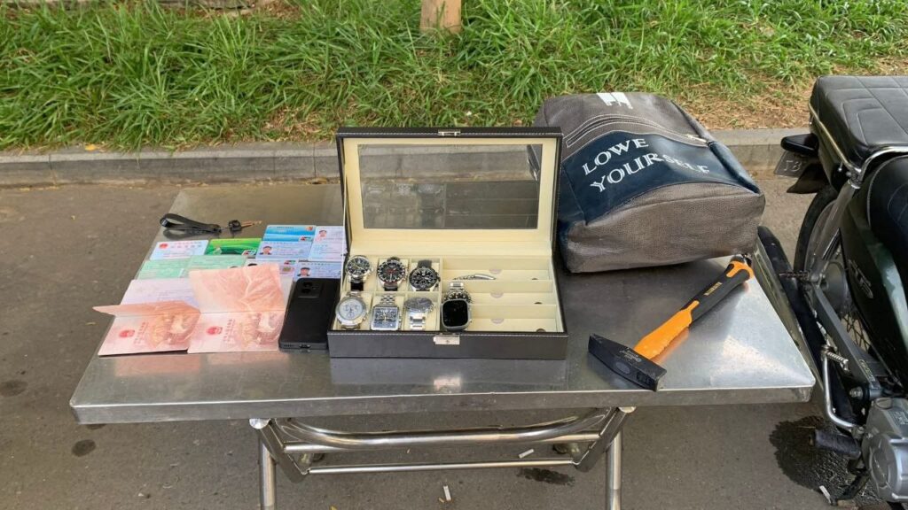 ករណីទី២.គាស់ទ្វារផ្ទះ លួចយកទ្រព្យត្តិ ១.នាឡិកាដៃចំនួន ៩គ្រឿង មានម៉ាកដូចជា:១/ម៉ាក Longineចំនួន ១គ្រឿង,២/ម៉ាក Sortចំនួន ២គ្រឿង, ៣ម៉ាក Tagheur ចំនួន ១គ្រឿង, ៤/ម៉ាក Old Tissotចំនួន ២គ្រឿង, ៥/ម៉ាក IWatchចំនួន ៣គ្រឿង, ៦/ខ្សែរកម៉ាក LV លោហៈធាតុពណ៌ទឹកប្រាក់ ចំនួន ១ខ្សែនិងខ្សែដៃម៉ាក LVលោហៈធាតុពណ៌ទឹកប្រាក់ចំនួន ១ខ្សែ (សរុបជាទឹកប្រាក់ ប្រហែល ១០០០០$ មួយម៉ឺនដុល្លារអាមេរិក)។