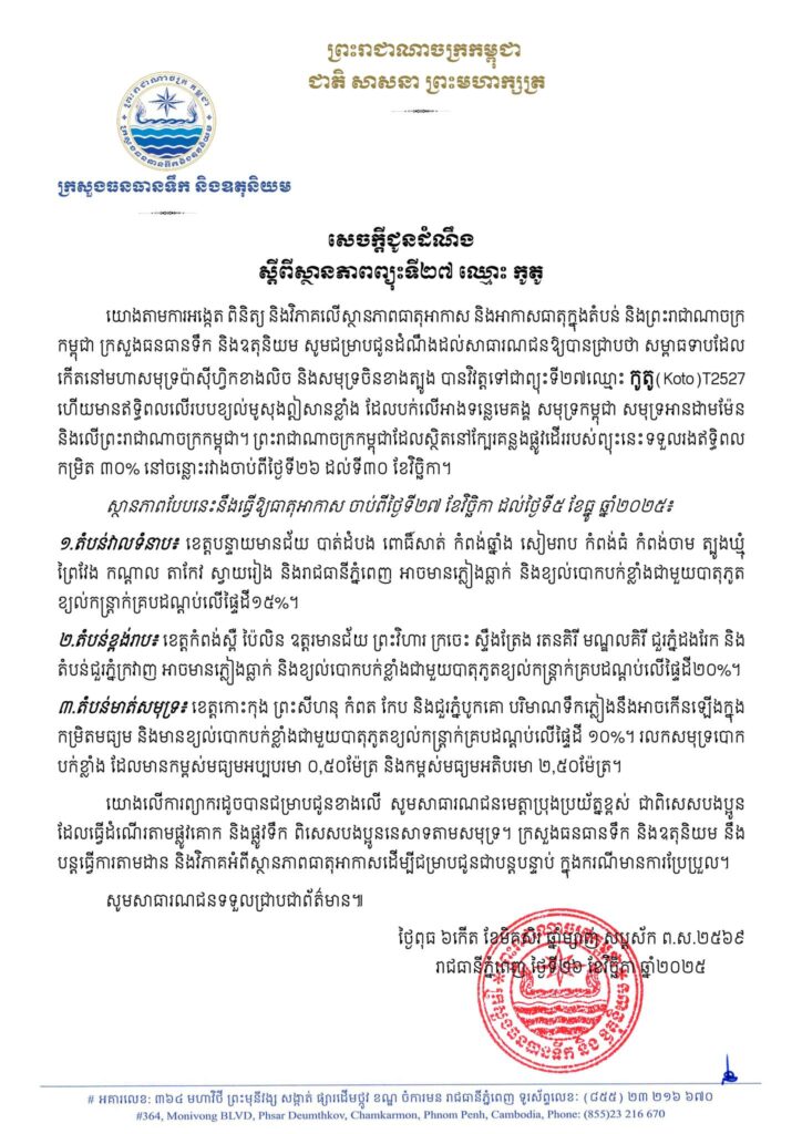យោងតាមការអង្កេត ពិនិត្យ និងវិភាគលើស្ថានភាពធាតុអាកាស និងអាកាសធាតុក្នុងតំបន់ និងព្រះរាជាណាចក្រកម្ពុជា ក្រសួងធនធានទឹក និងឧតុនិយម សូមជម្រាបជូនដំណឹងដល់សាធារណជនឱ្យបានជ្រាបថា សម្ពាធទាបដែល កើតនៅមហាសមុទ្រប៉ាស៊ីហ្វិកខាងលិច និងសមុទ្រចិនខាងត្បូង បានវិវត្តទៅជាព្យុះទី២៧ឈ្មោះ កូតូ(Koto)T2527 ហើយមានឥទ្ធិពលលើរបបខ្យល់មូសុងឦសានខ្លាំង ដែលបក់លើអាងទន្លេមេគង្គ សមុទ្រកម្ពុជា សមុទ្រអានដាមម៉ែន និងលើព្រះរាជាណាចក្រកម្ពុជា។ ព្រះរាជាណាចក្រកម្ពុជាដែលស្ថិតនៅក្បែរគន្លងផ្លូវដើររបស់ព្យុះនេះទទួលរងឥទ្ធិពល កម្រិត ៣០% នៅចន្លោះរវាងចាប់ពីថ្ងៃទី២៦ ដល់ទី៣០ ខែវិច្ឆិកា។
